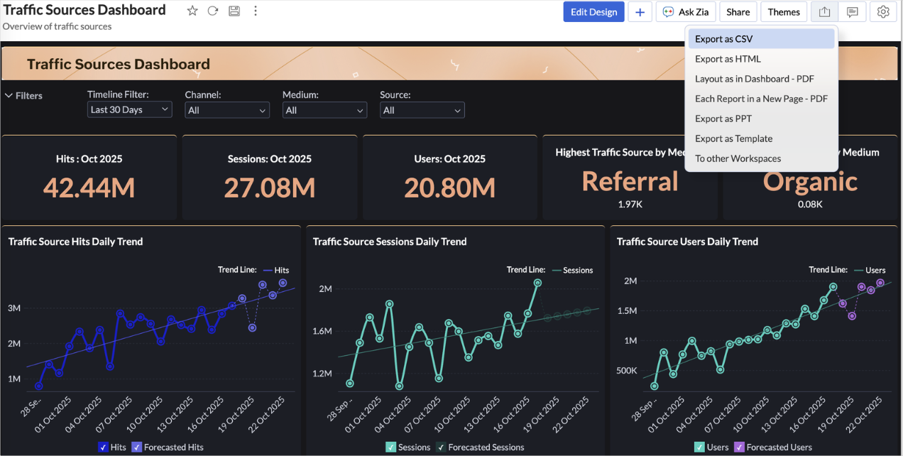 Export dashboards directly as CSV files, making it easier to share, analyze, or archive your data outside the platform. This enhancement allows you to retain the underlying data from your reports and widgets, enabling seamless offline access and further analysis.