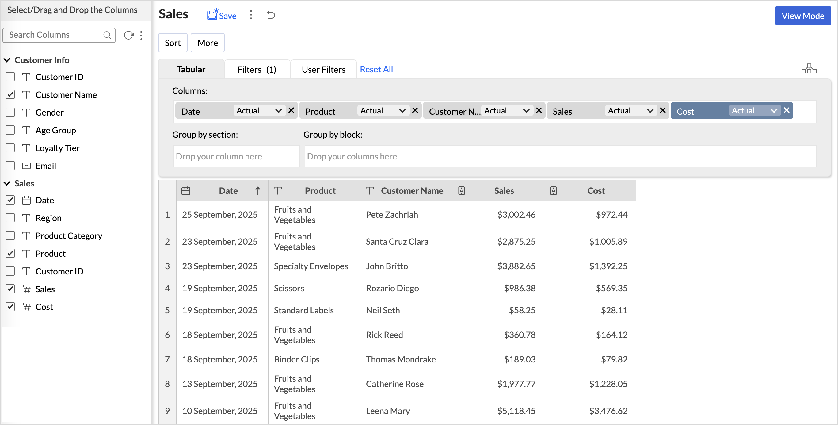 With this enhancement, all tables linked via lookup columns are now available when creating a tabular view. This allows you to build reports that include multiple key metrics and dimensions. Previously, tabular views could be created from a single table only.