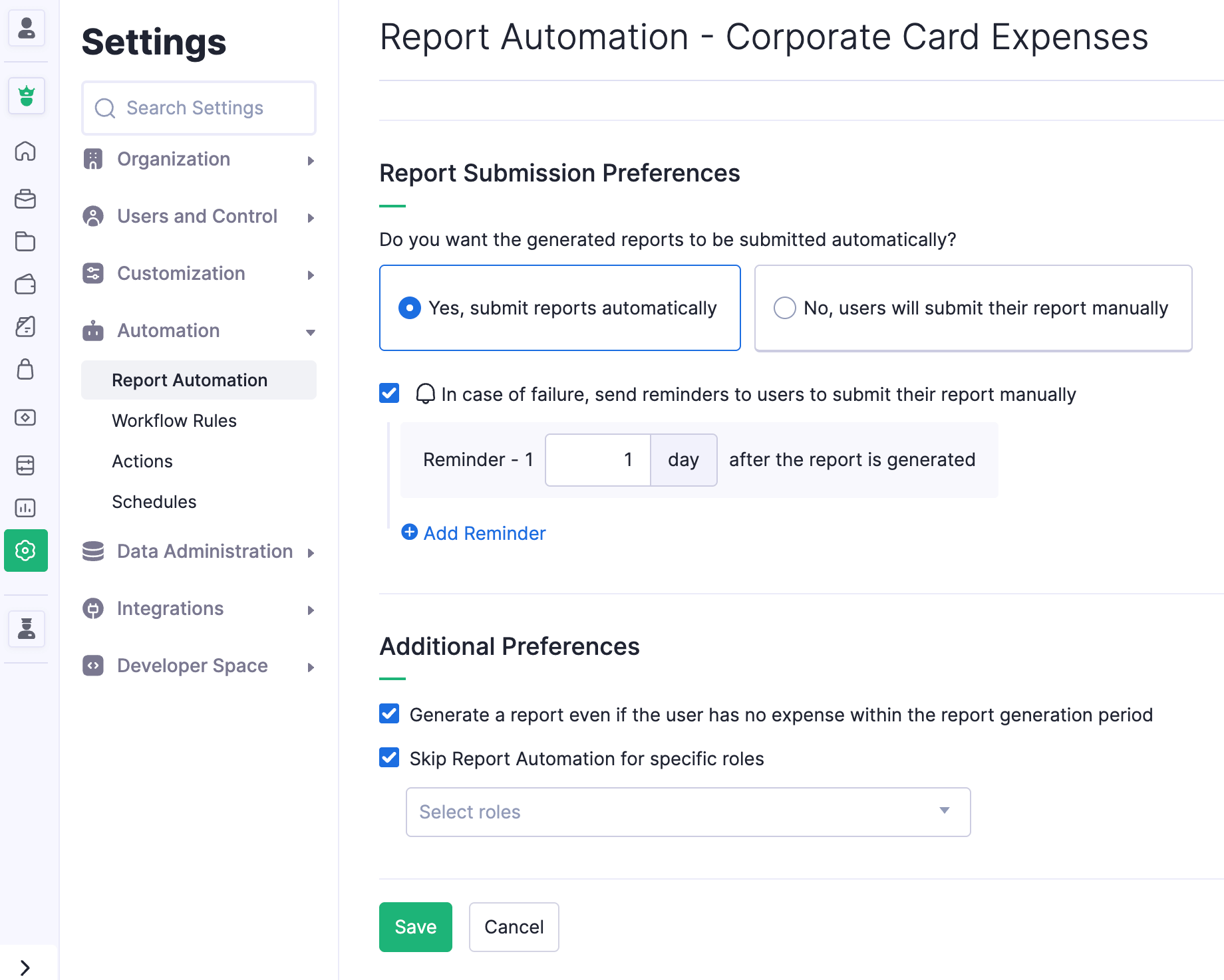 - Mark Generate a report even if the user has no expense within the report generation period if you want to automate report generation even if the user has not recorded any expense during the month. Empty reports will be generated and submitted so that you know that the user hasn’t incurred any expense using their corporate card in that month, or you can maintain records for your future reference.