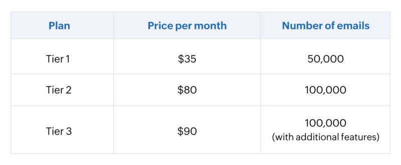 For instance, a user under the tier 1 plan will get 50,000 emails at $35 per month. If the number of emails used goes beyond this limit (say 80,000 emails), they will be billed $24 for the 30,000 extra emails that are sent beyond the 50,000 limit. The total bill amount will be $59, which is comparatively cheaper than the next tier plans ($80 for 1,00,000). For the customers who are satisfied with the Tier 1 features but want more than 50,000 emails, providing this addon would please them because they only need to pay for the additional emails they use instead of upgrading to the next tier to satisfy that single requirement.