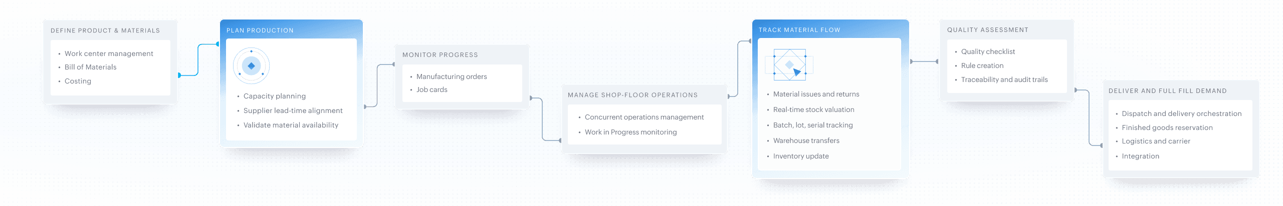 Zoho ERP is structured around the actual sequence of manufacturing operations, supporting each stage from product definition and planning through execution, quality control, and fulfillment.