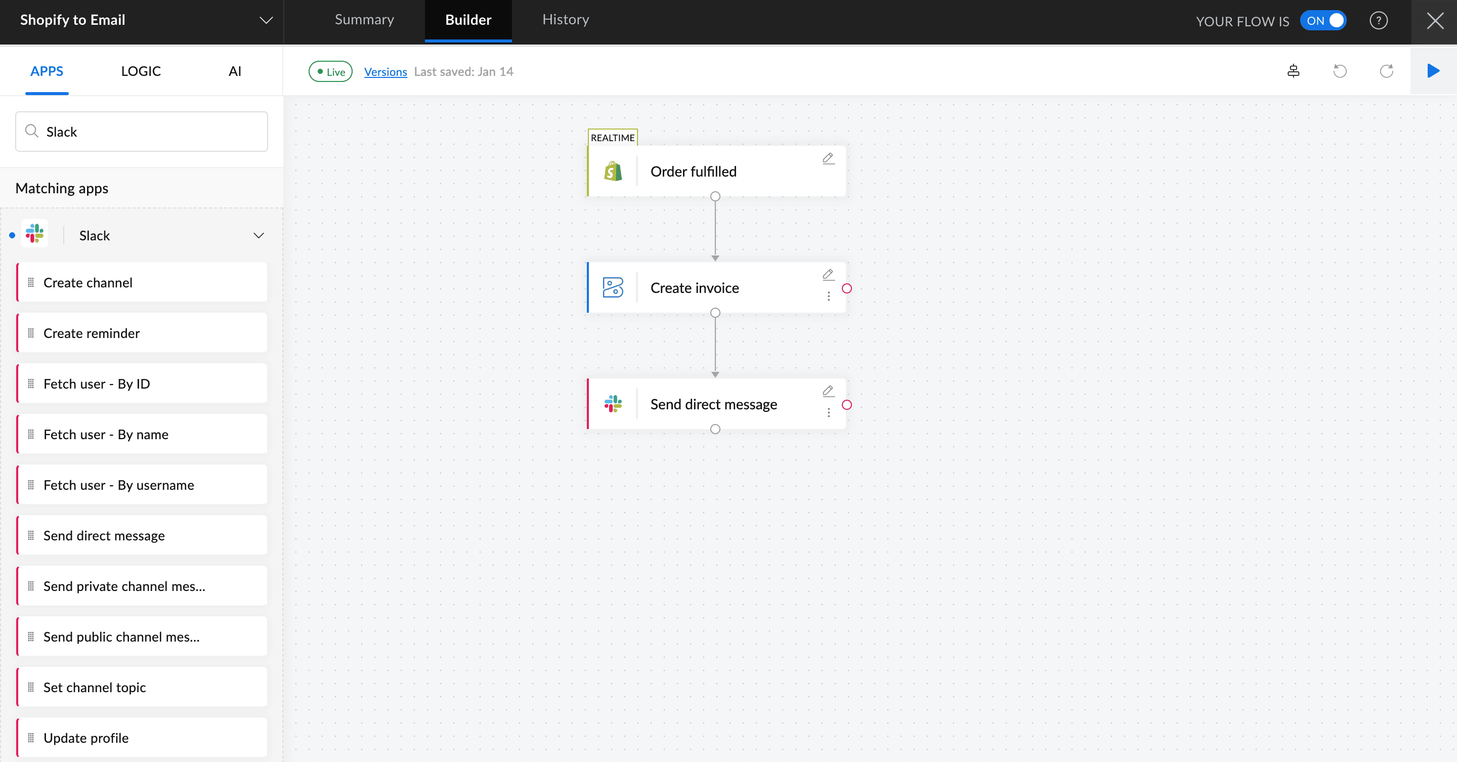 In the workflow below, when an order is completed in Shopify, an invoice is automatically created in Zoho Books, and the customer is notified via Slack about the invoice creation.