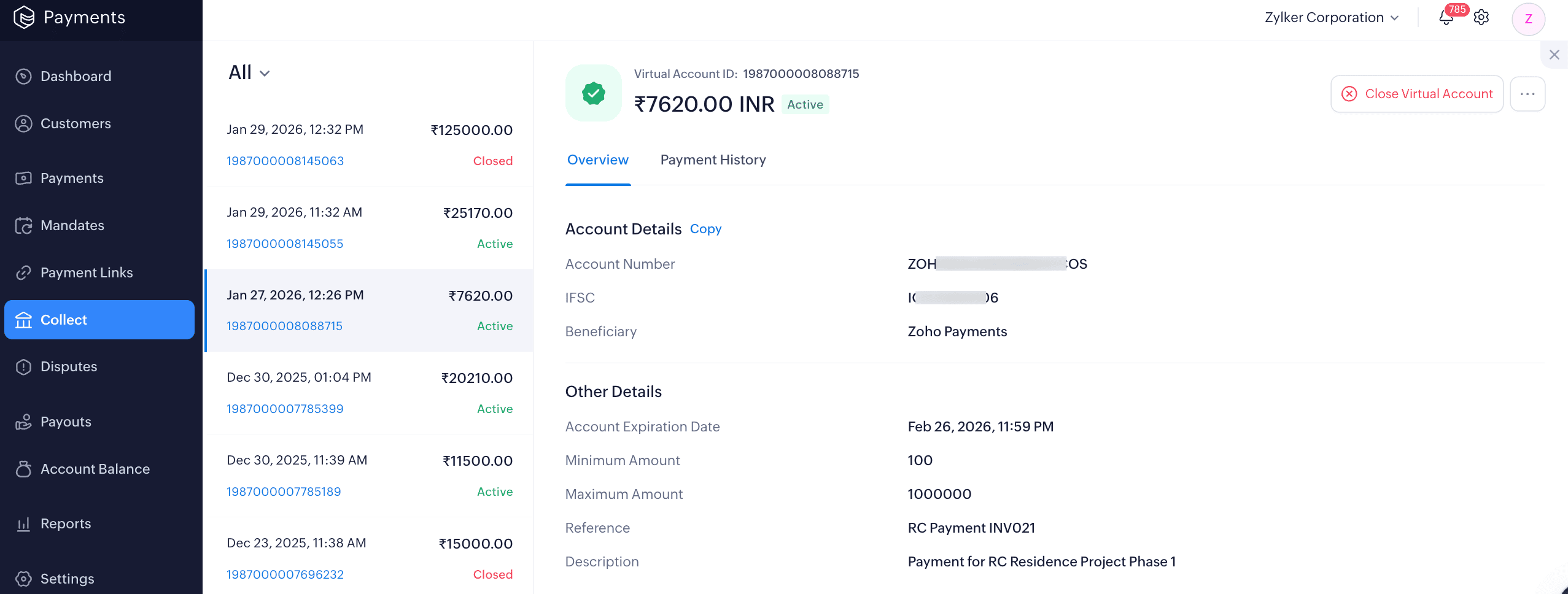 Account Details: View the details of the virtual account, such as the Account Number, IFSC, and Beneficiary. You can click Copy next to the account details to copy and share them with your customers.