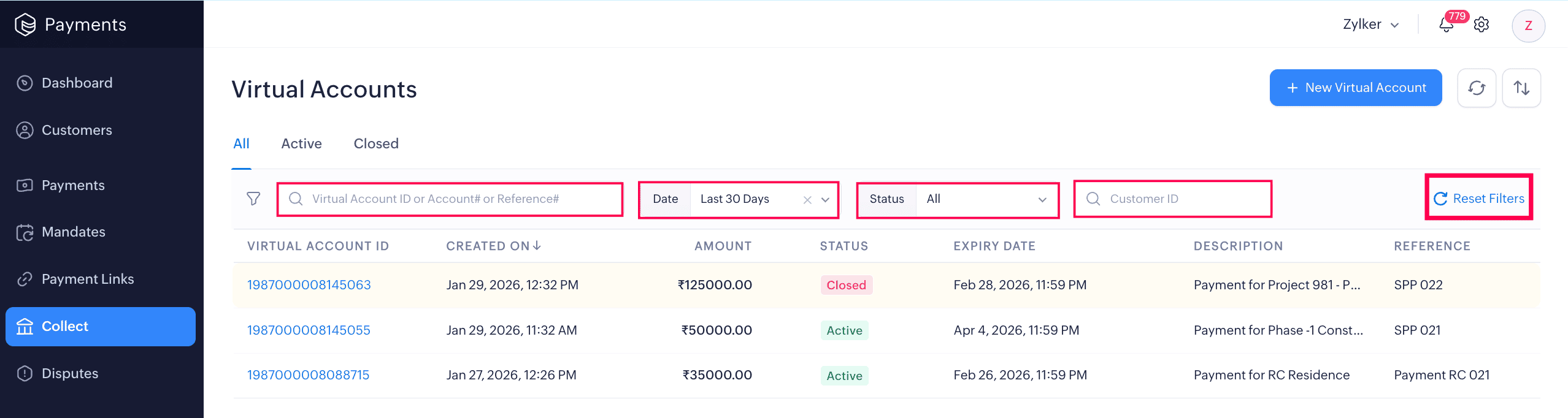 The Collect module in the left sidebar displays all the virtual accounts you have created. The list view shows key details such as Virtual Account ID, Created On Date, Amount, Status, Expiry, Description, and Reference.