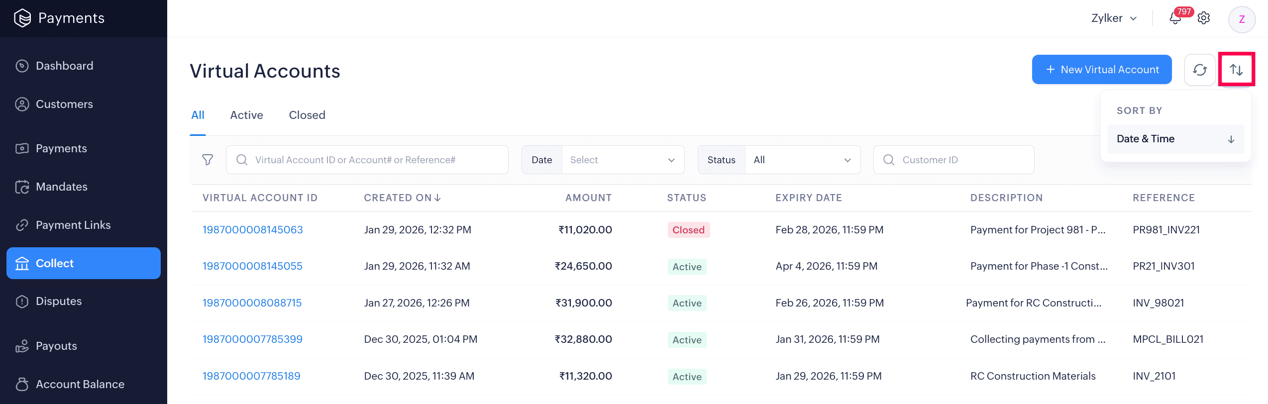 Sort virtual accounts by Date & Time in ascending or descending order.