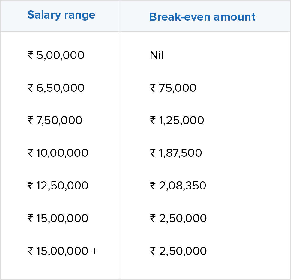 For every gross income drawn by an employee, there is a break-even investment amount at which the tax liability will be the same under the old tax regime and the new tax regime. Once you identify that break-even amount, it’s a matter of knowing if you can make investments to match up to that break-even amount or not. If you invest more than the break-even point, your tax liability will be less with the current tax system. If you invest less than the break-even point, your tax liability will be more with the current tax system, so you are better off switching to the new tax system.