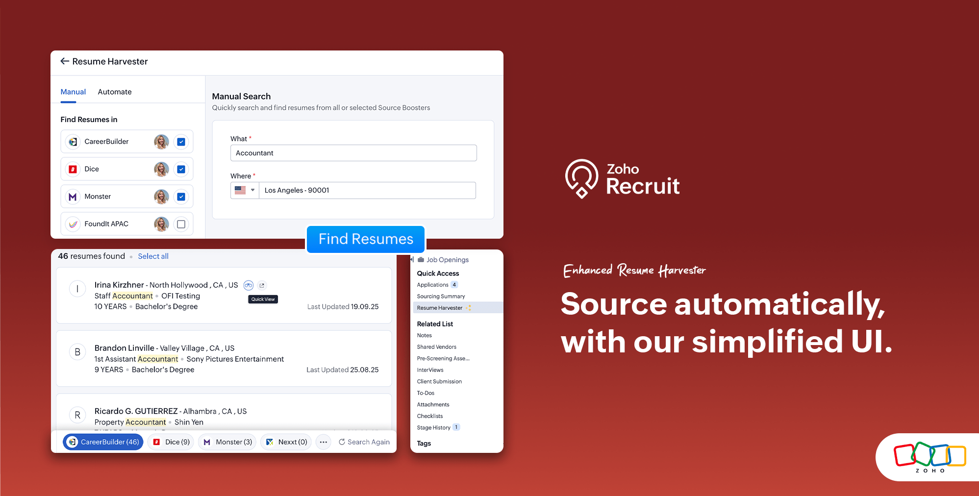 EnhancementsResume Harvester is now easier to use. Launch it directly from job openings, suspend multiple auto searches at once, and choose between Quick View or full profiles. These enhancements reduce steps and make sourcing faster and more efficient.