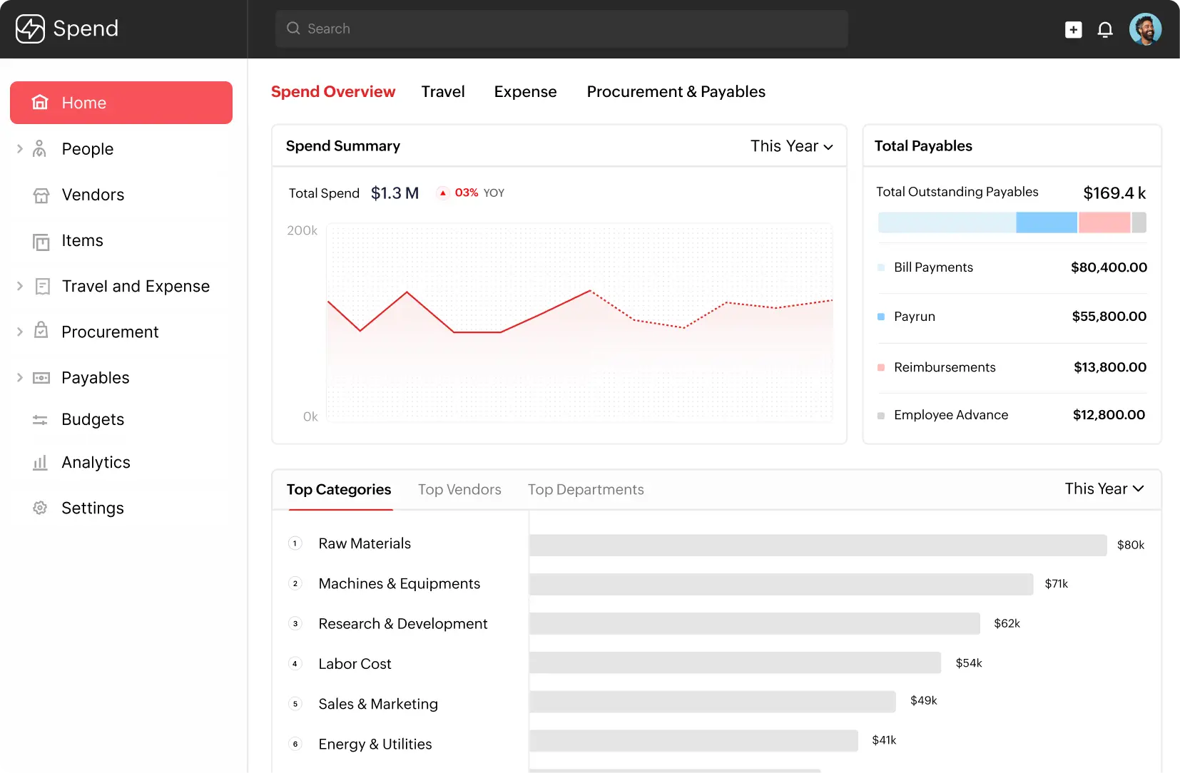 Zoho Spend is the industry-first, complete spend management platform. It unifies travel, expense, procurement, AP automation, and payroll, giving businesses the power to track, control, and save on all business spending.