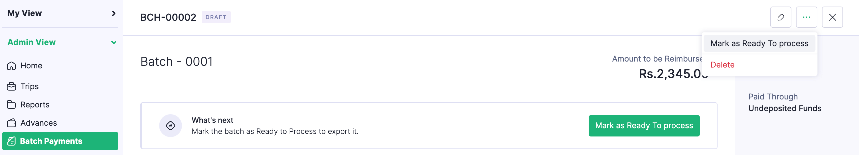 Once a batch is ready to be processed, you can export and upload them to your bank portal. Once you make the payment in the bank portal, you can mark the batch as processed, and the respective reimbursements will be updated to the Reimbursed status.