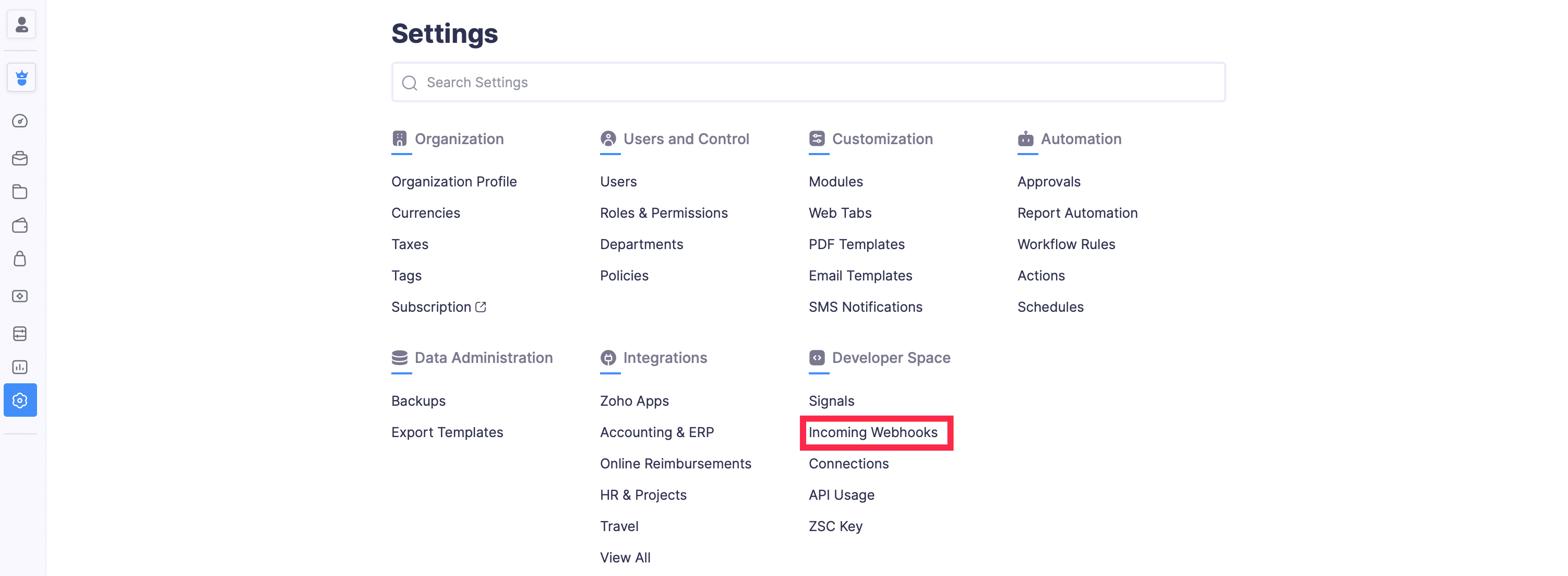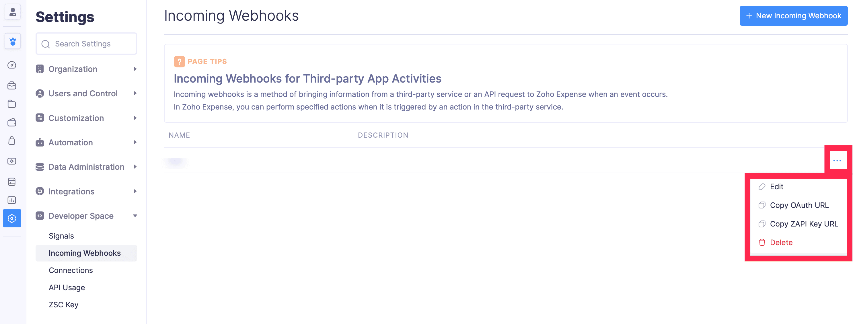 You can create multiple incoming webhooks based on the functions you prefer to execute in Zoho Expense. To create an incoming webhook: