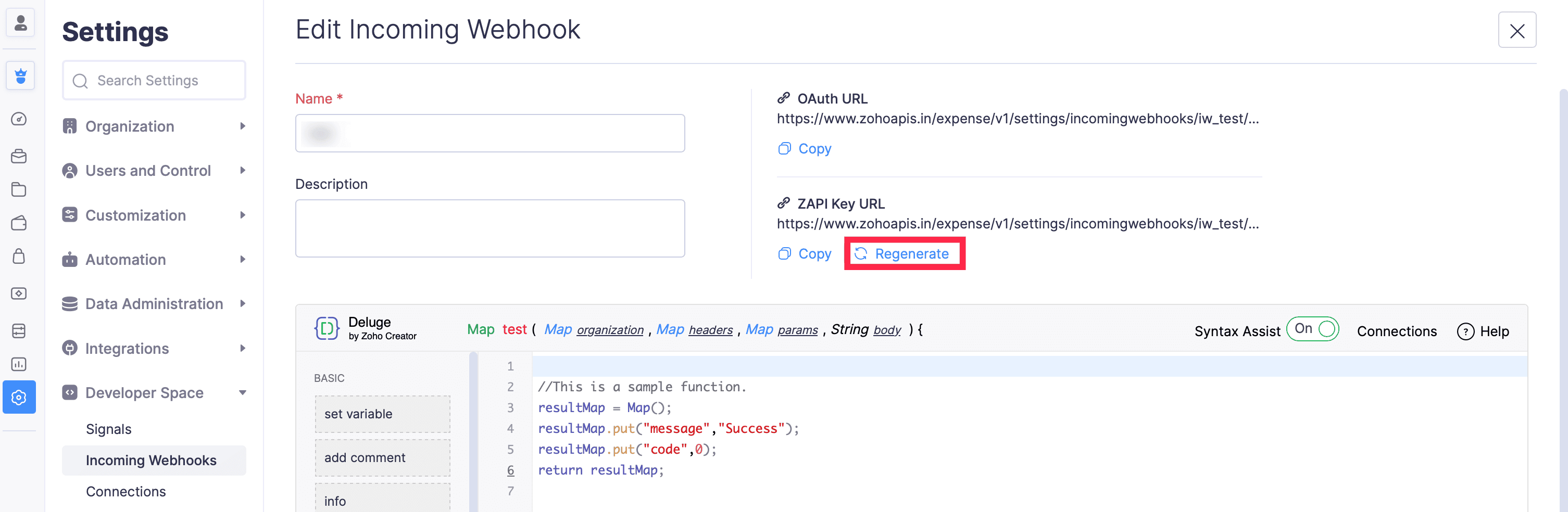 The OAuth URL and ZAPI Key URL will be generated and displayed in a pop-up. You can copy and use this webhook URL to trigger the incoming webhook in Zoho Expense.