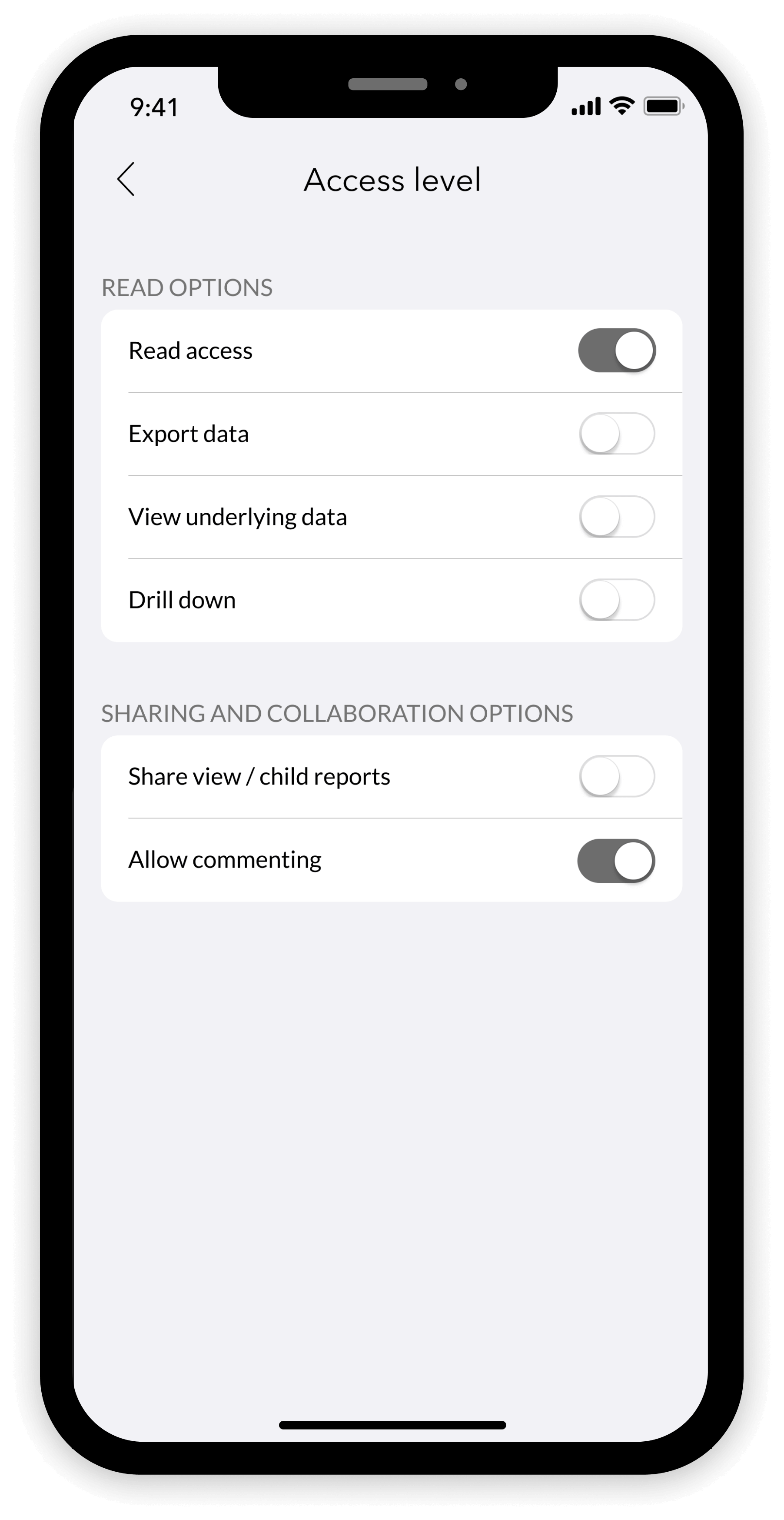 4. To change sharing permissions, tap the name of the shared user or group. The Access Level page showing the user permissions of the selected user or group will open. You can change the user permissions as and when needed.
