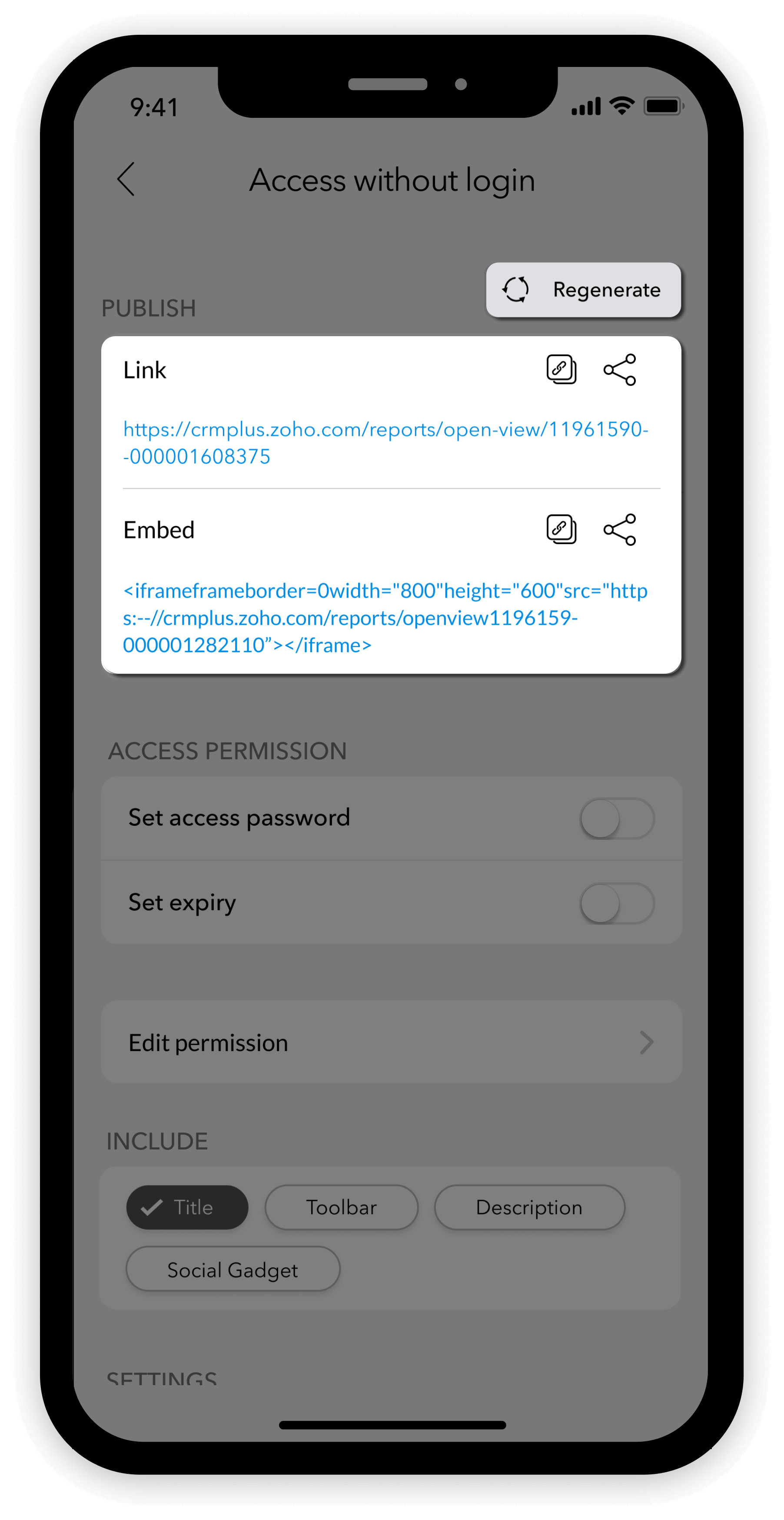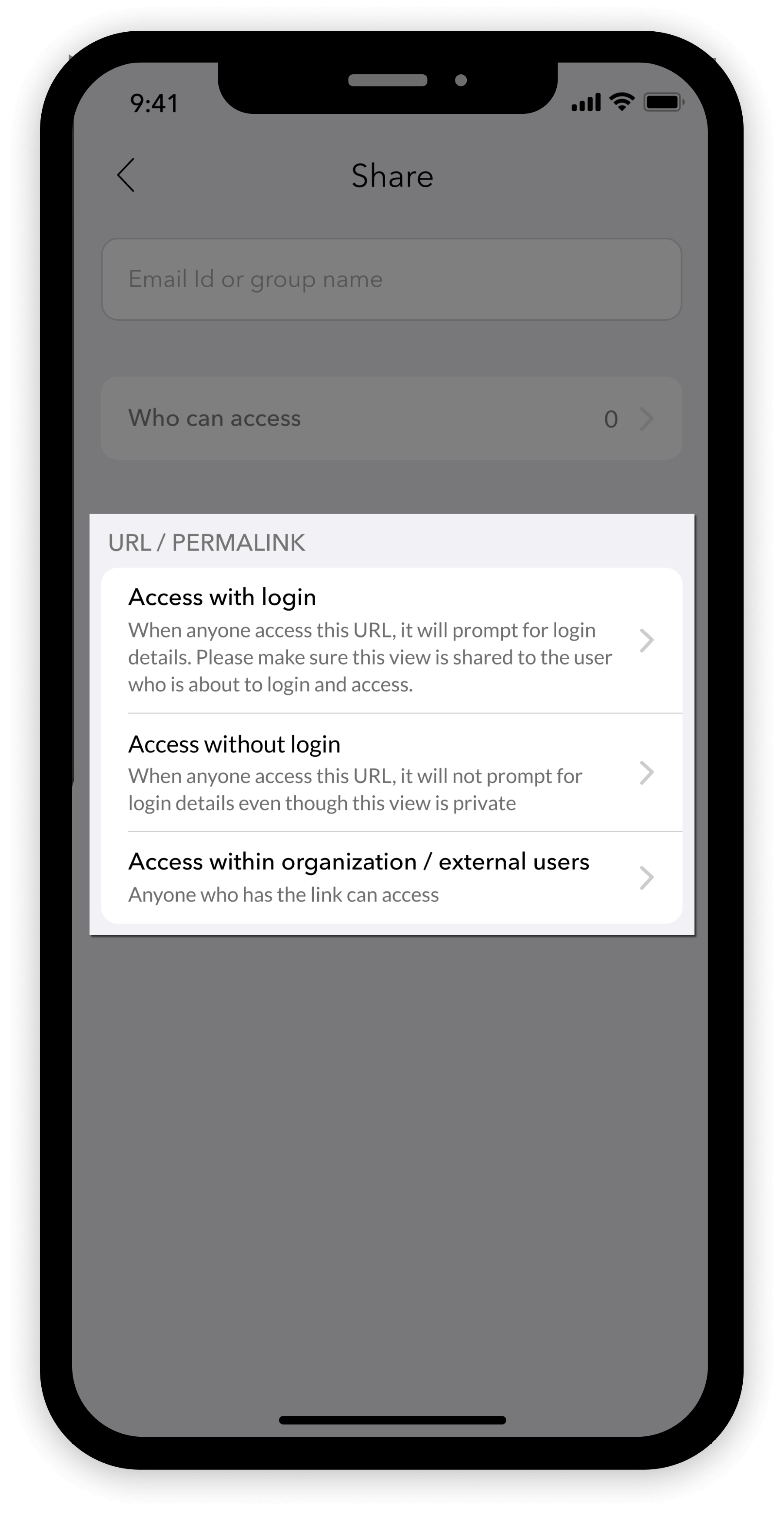 • URL / PERMALINK - Tap the URL / PERMALINK section to generate unique URLs for the published dashboards. It can be configured with one of the following options - Access with login, Access without login, and Access within organization / external users.