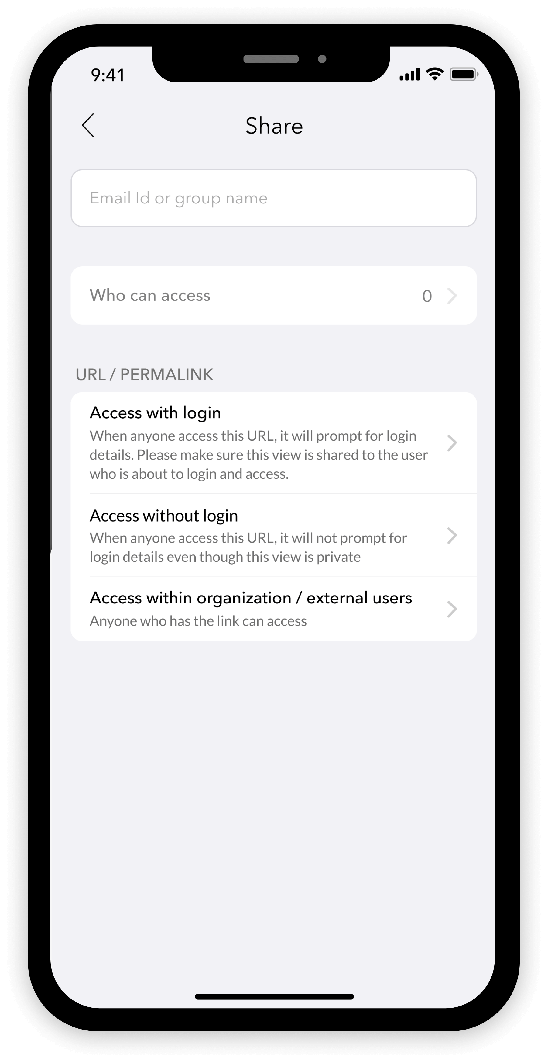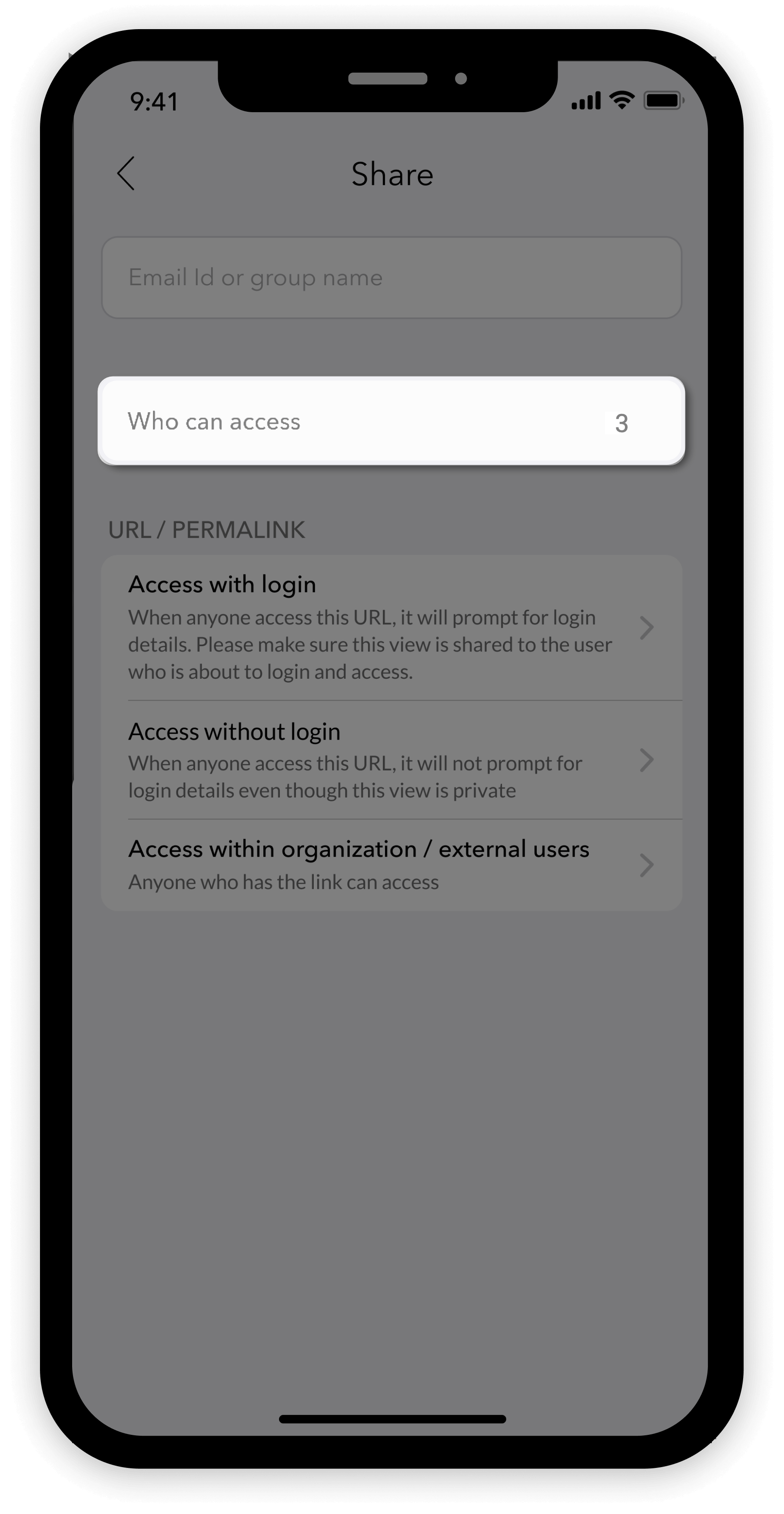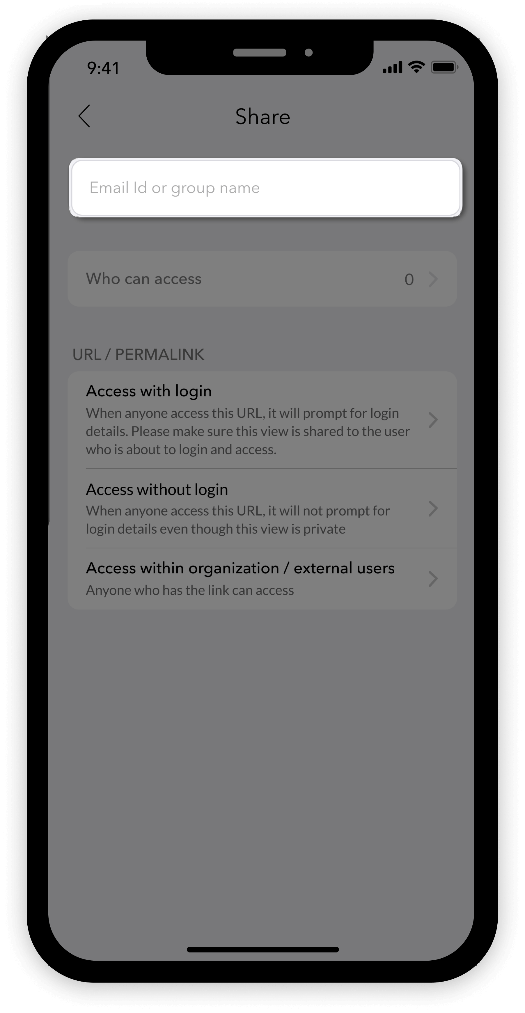• Share - Tap the Email id or group name field to share the dashboard with private users or a group, and to specify their Access levels.