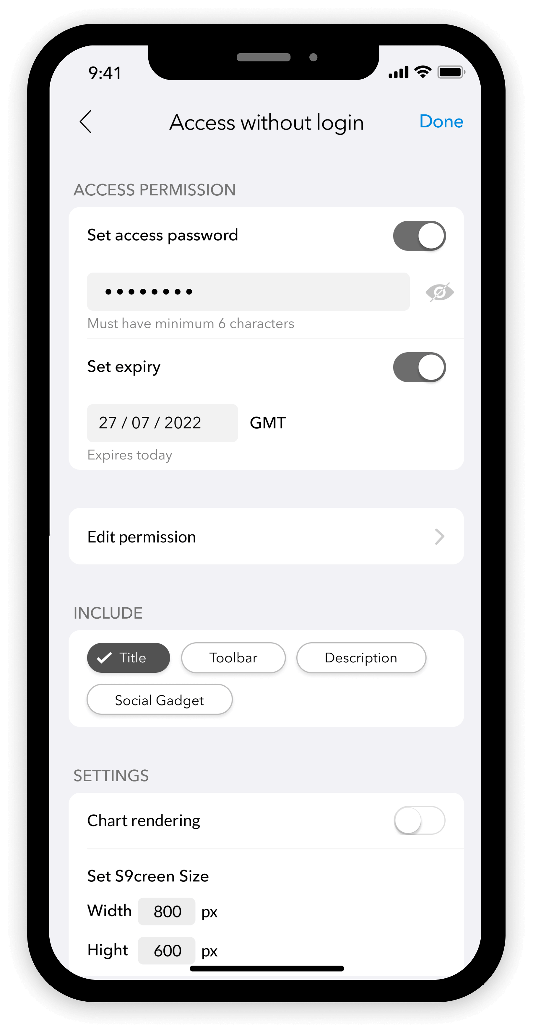 • Set screen size - You can set the screen size of your dashboard in pixels. This will be used in Embed Links to fix the screen size of the published dashboard.