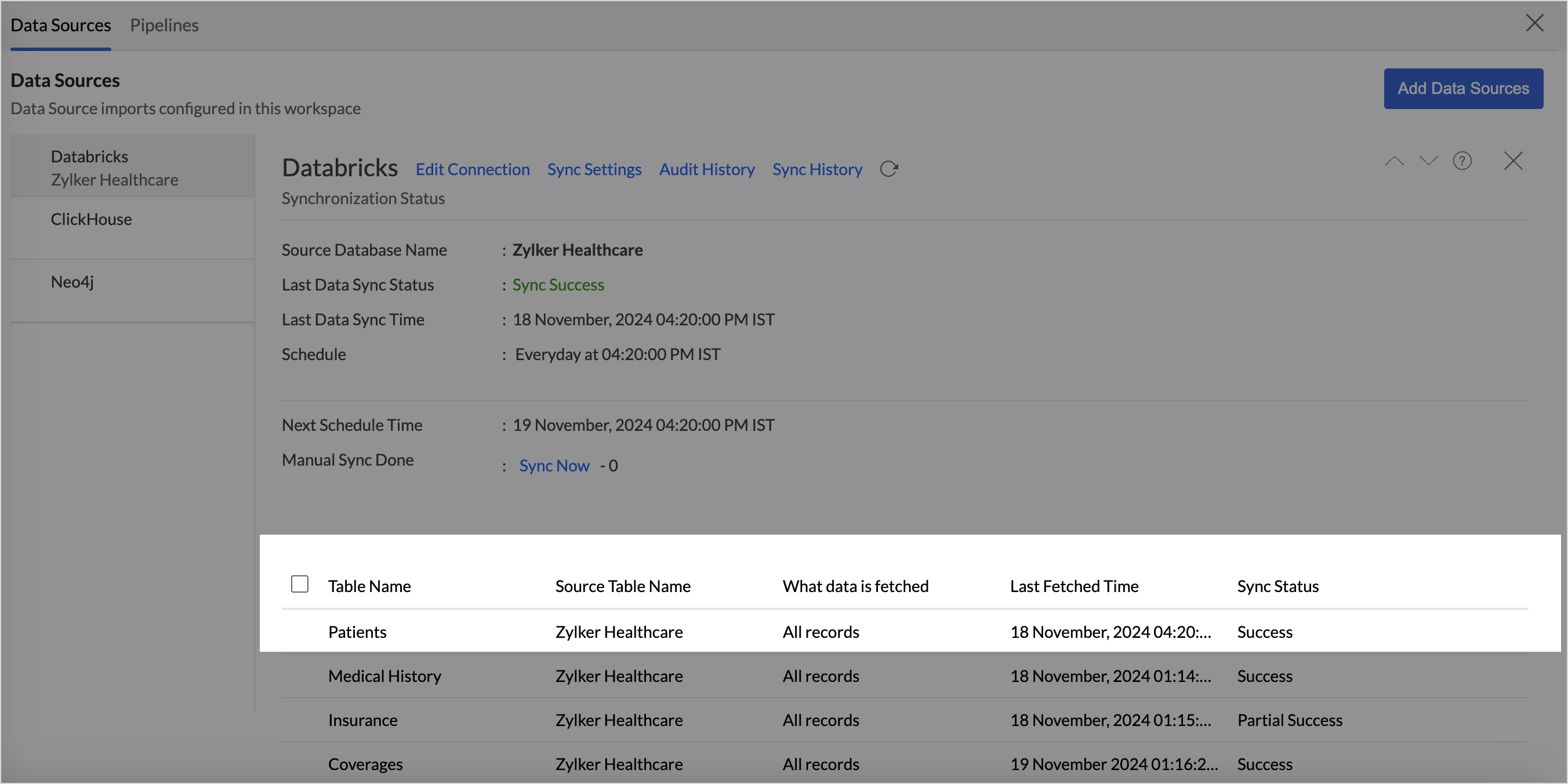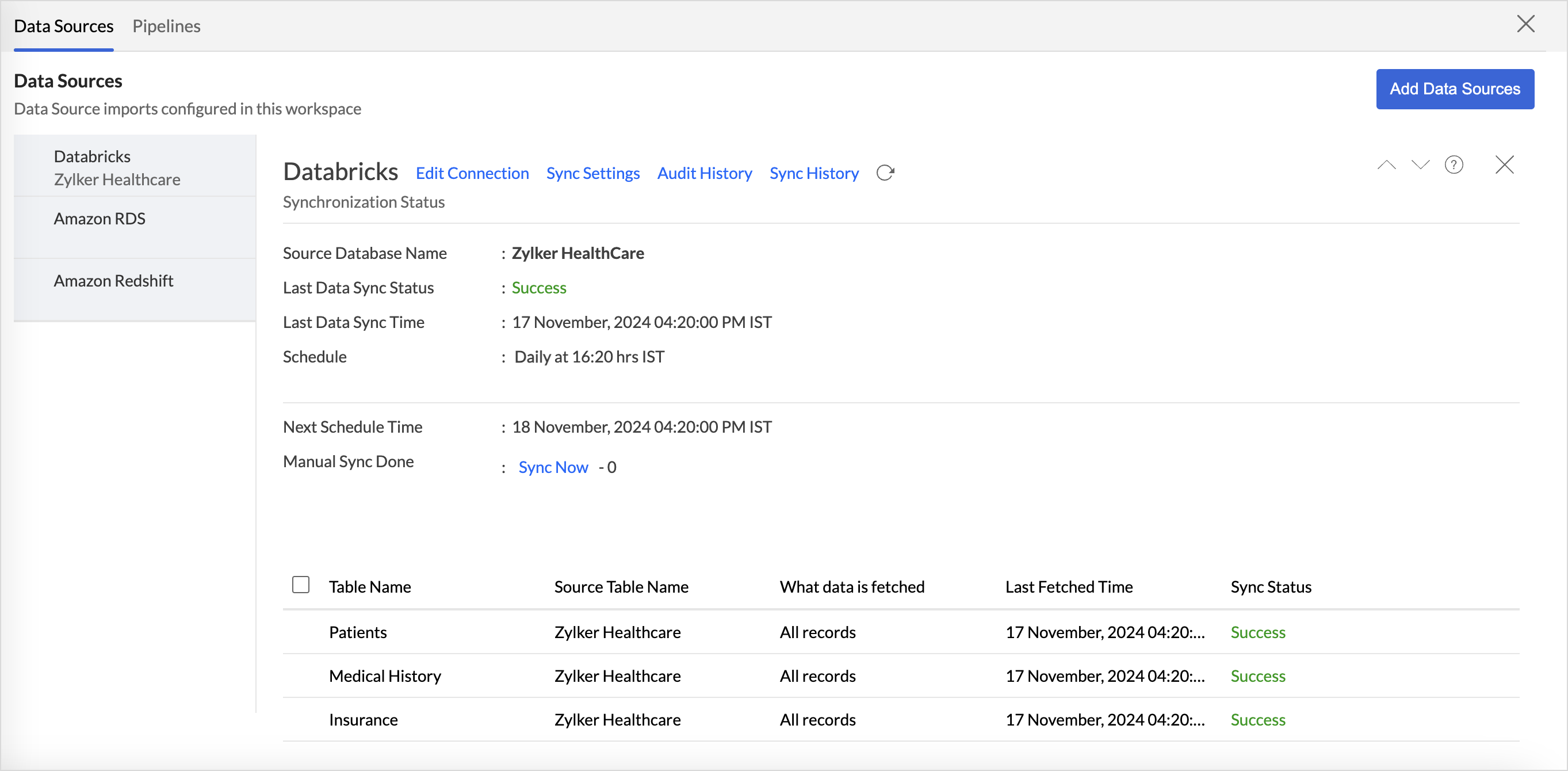 The Data Sources tab is the central hub that helps manage all the connection settings of the data sources in the workspace. It also helps keep tabs on the data sync status and notifies in the case of data sync failures. User with the Administrator Privilege can access the data sources tab and make necessary changes when needed.