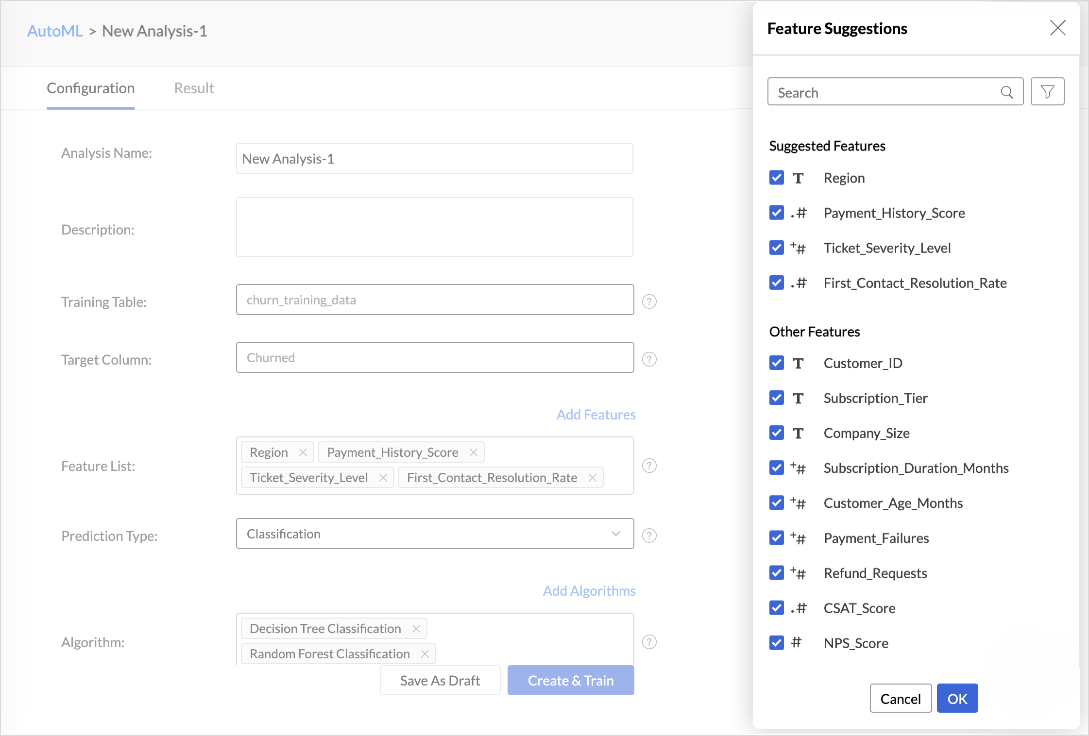 Zoho Analytics AutoML engine precisely recommends the necessary features and algorithms for training the data based on the target column. It automatically detects and excludes unique identifiers that do not affect the target column prediction. This ensures the model focuses on relevant data, improving both efficiency and accuracy during training.