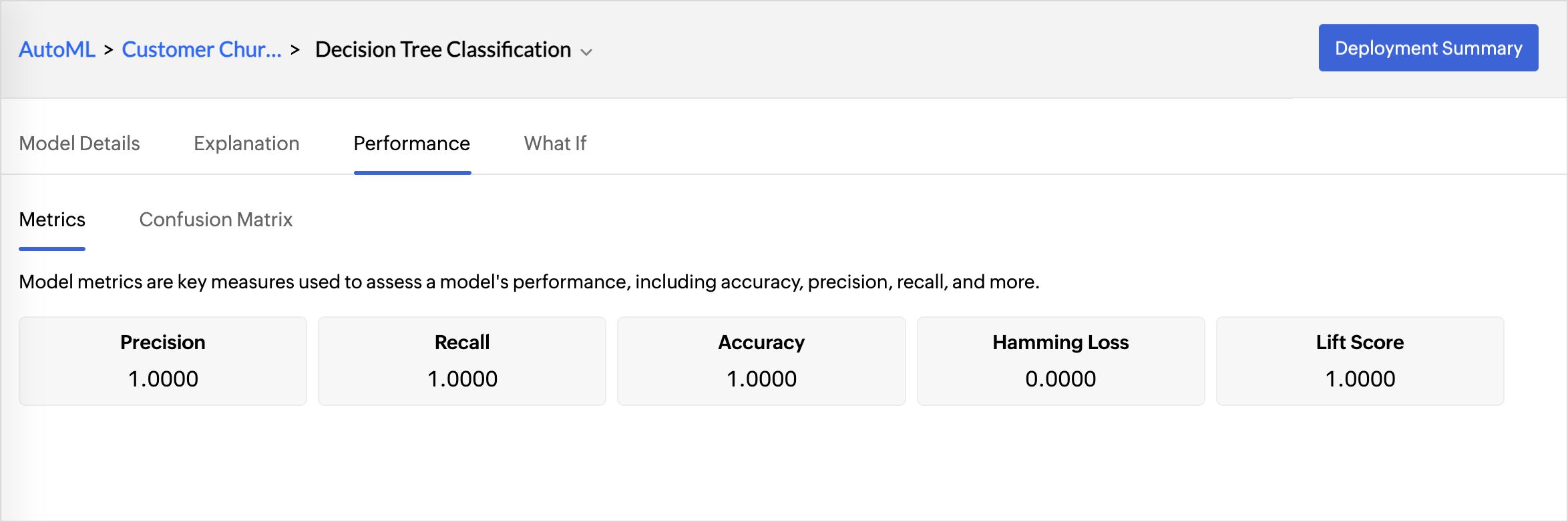 Model evaluation helps understand how well your model is performing and how effectively it can predict outcomes on new or unseen data. Once training is complete, the Model Score along with other essential metrics such as Precision, Recall, Accuracy, Hamming Loss and Lift Score are provided to assess performance.
