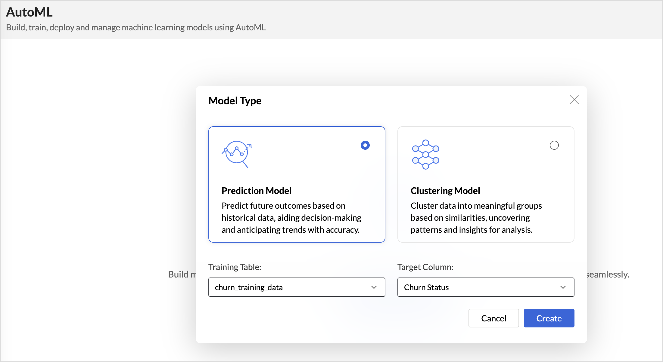 Access the AutoML builder in Zoho Analytics and choose the Prediction Model, as the objective is to predict a binary outcome, whether a customer is likely to churn or not.