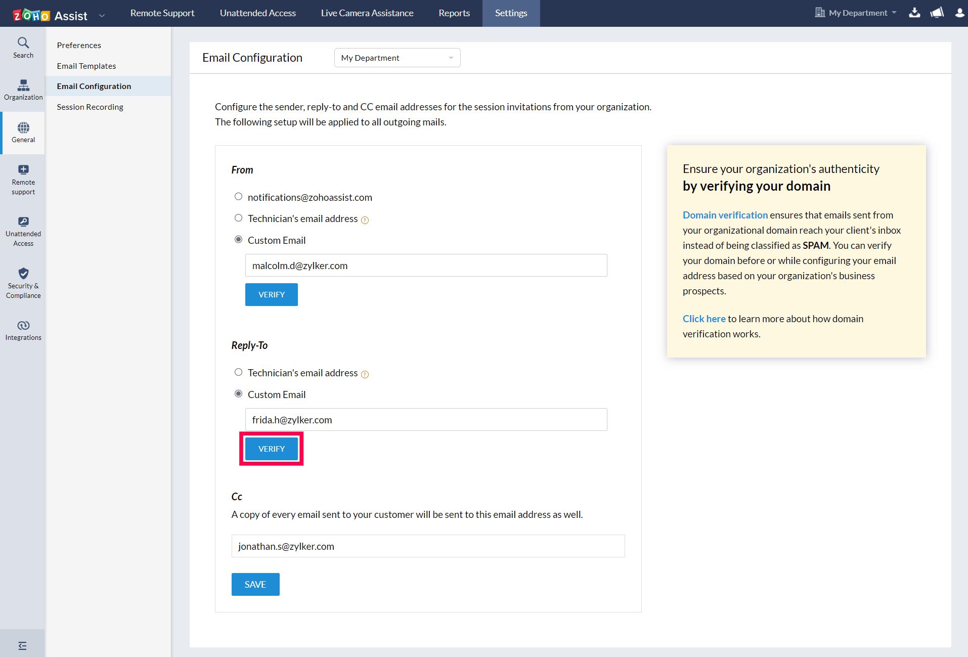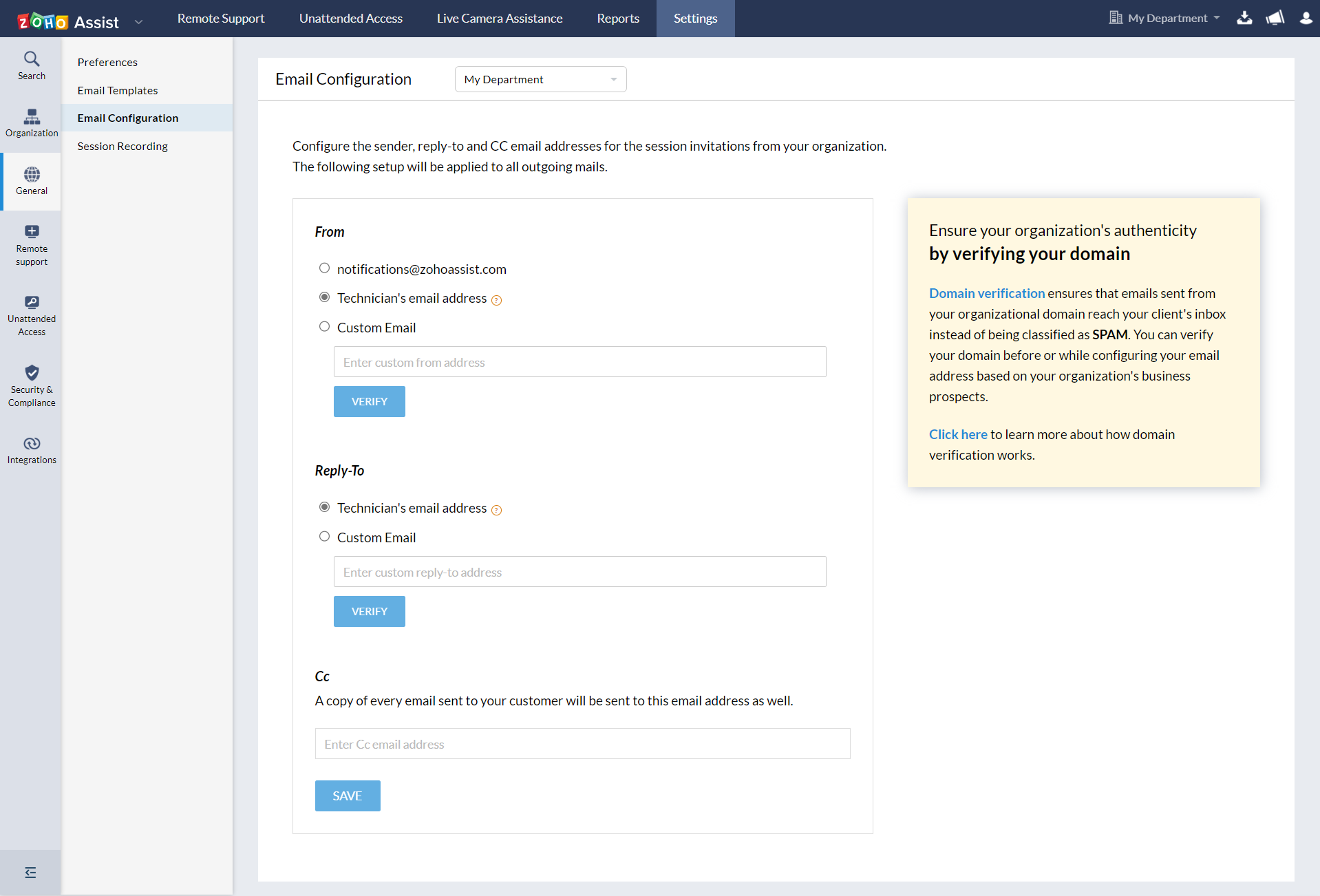 If you want every email sent from your organization to have a uniform sender email address, then enter the email ID in the Custom Email field and click VERIFY. The setup will be completed once verified.