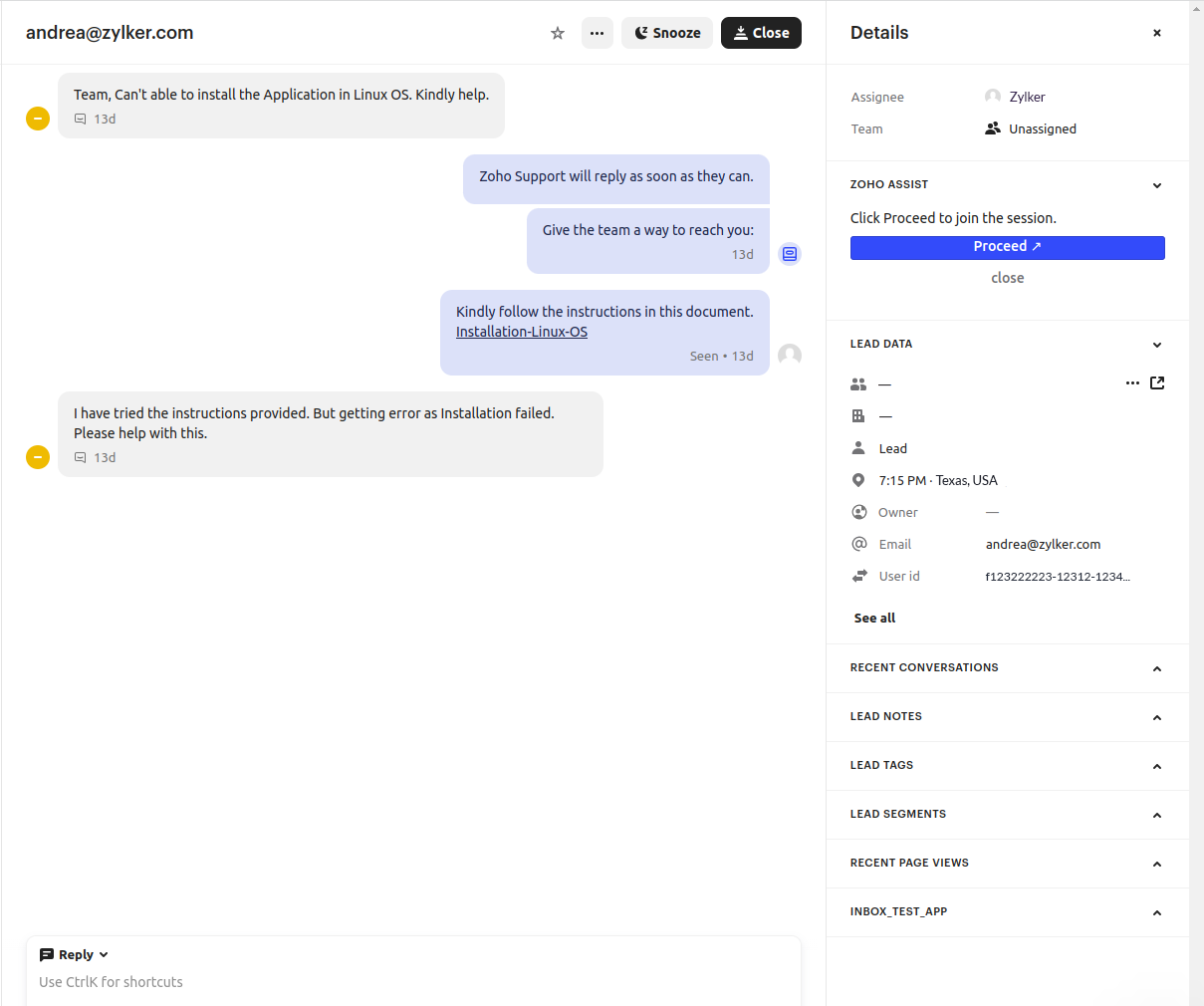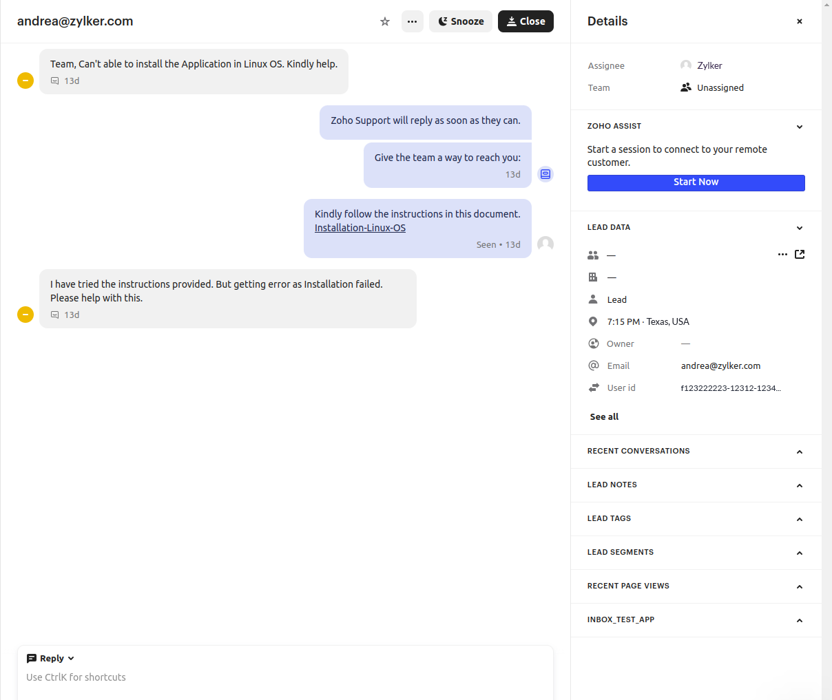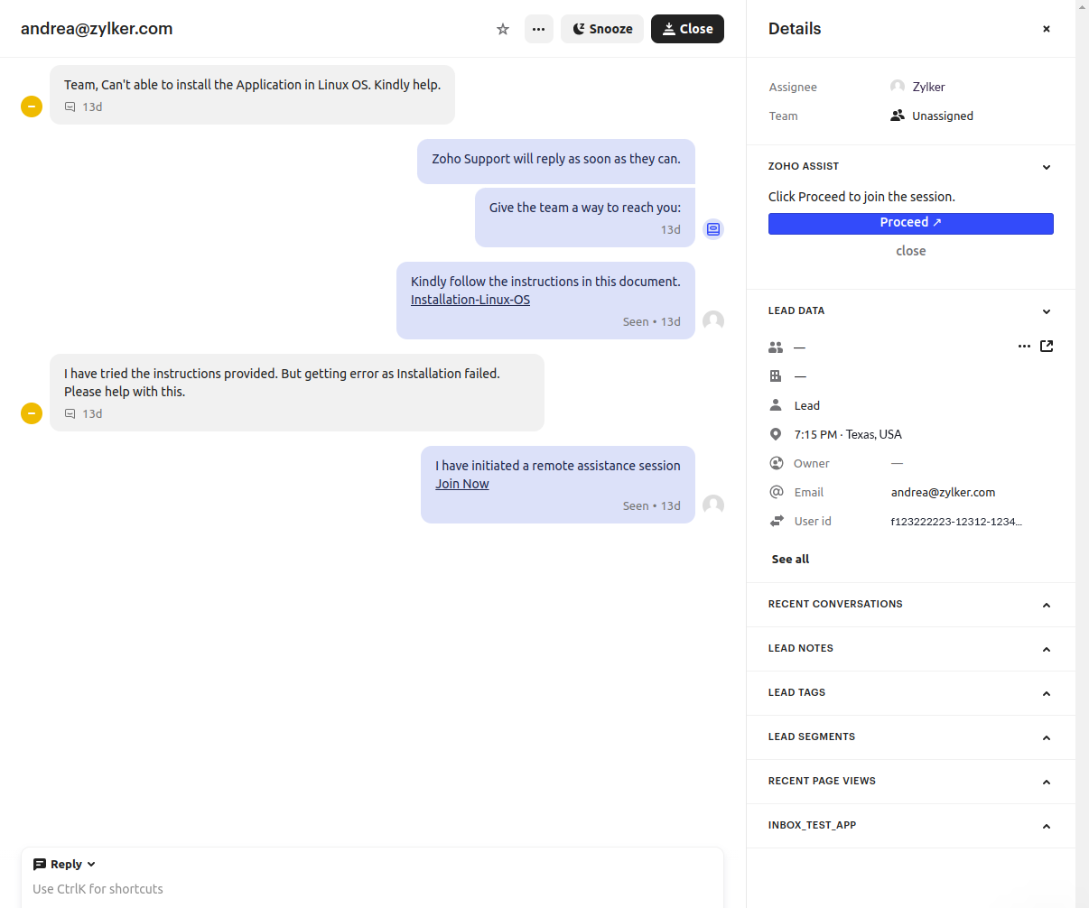 With Zoho Assist, you can start an instant remote support session and troubleshoot customer devices from directly within your Intercom chats. This seamless integration provides a convenient user experience and requires no additional software installation. Once your remote session is finished, you have the option to add important notes to your Intercom conversation for future use or follow-up.
