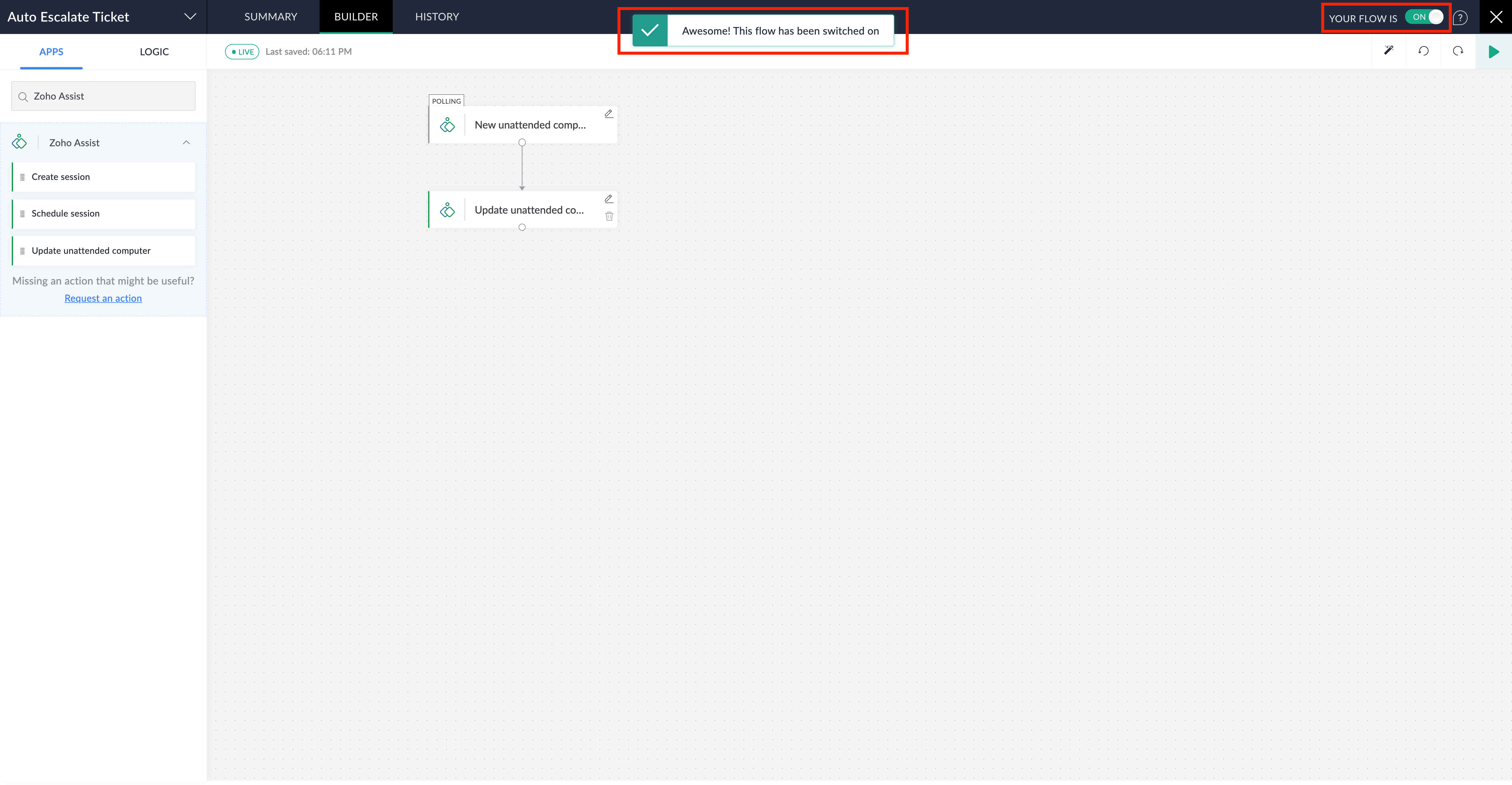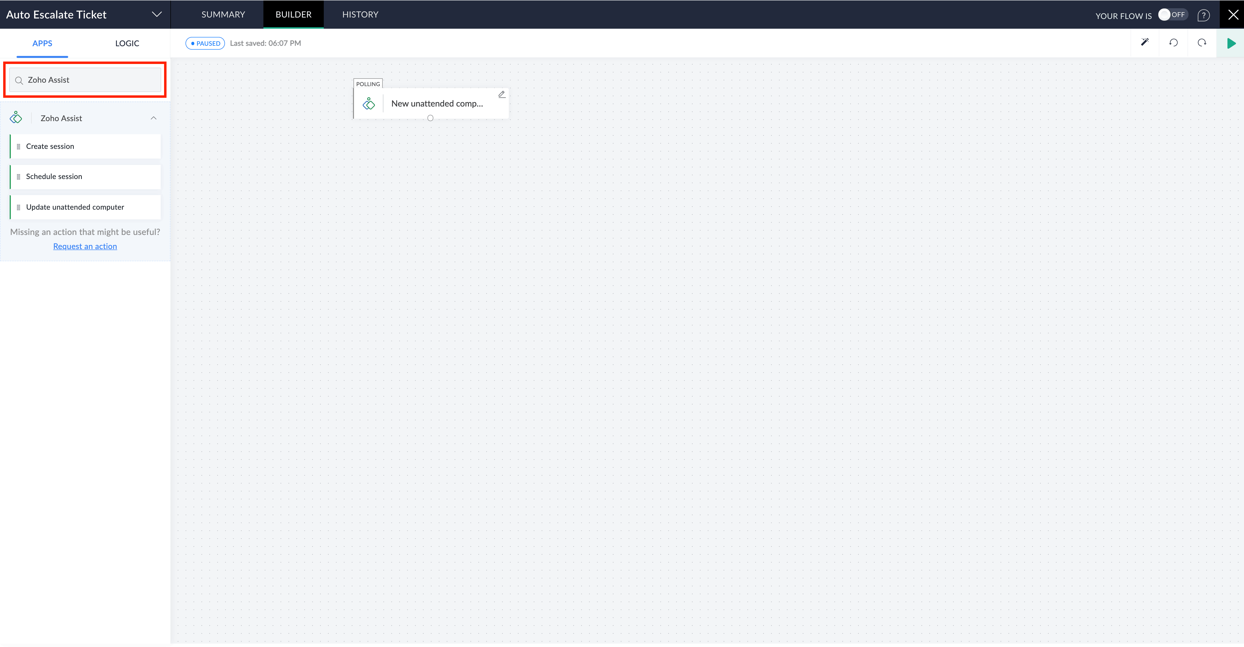 - Once your Zoho Assist connection is integrated with Zoho Flow, you'll be able to configure lists of tasks as actions using the applications and logic in the builder window.