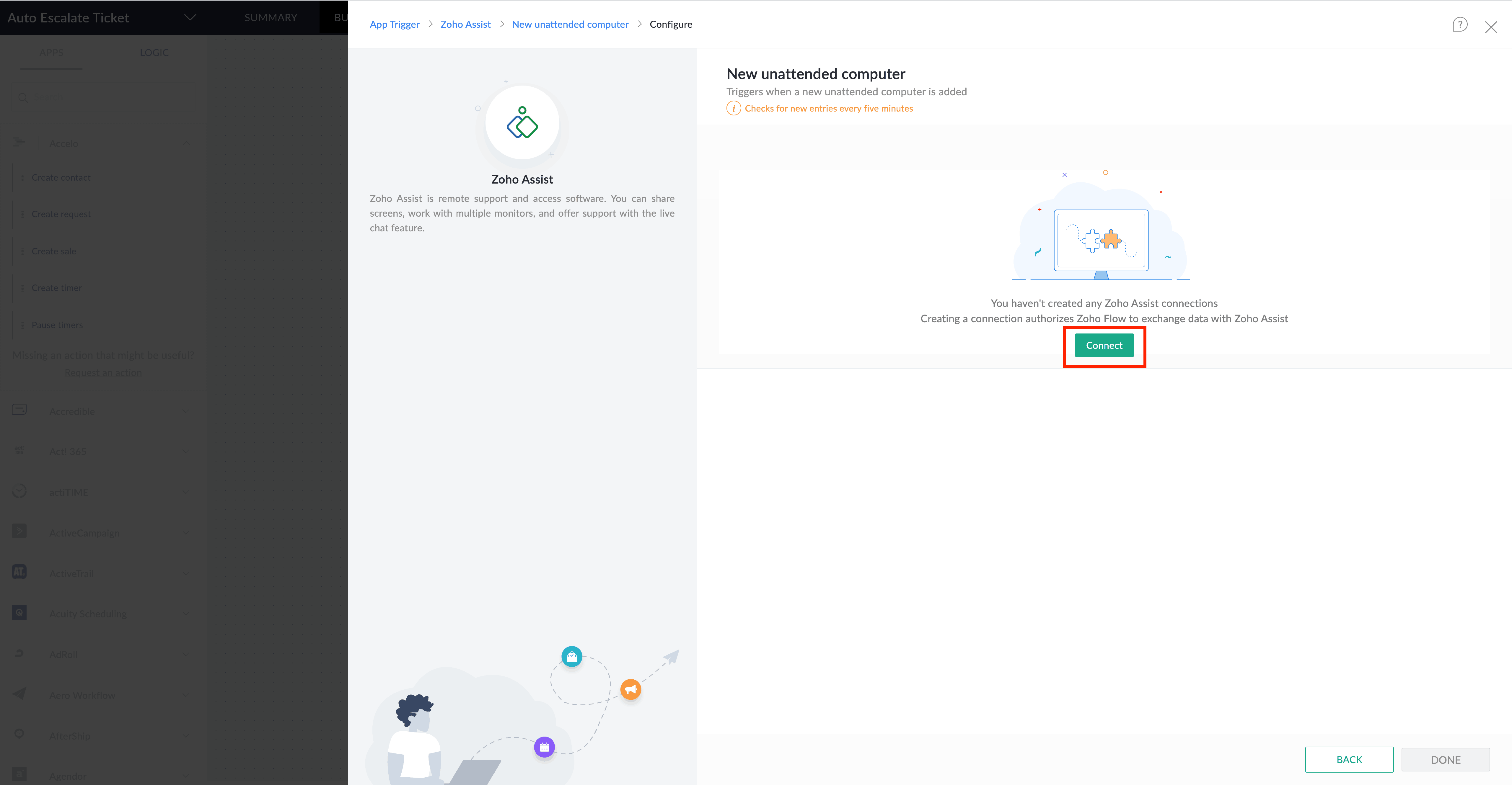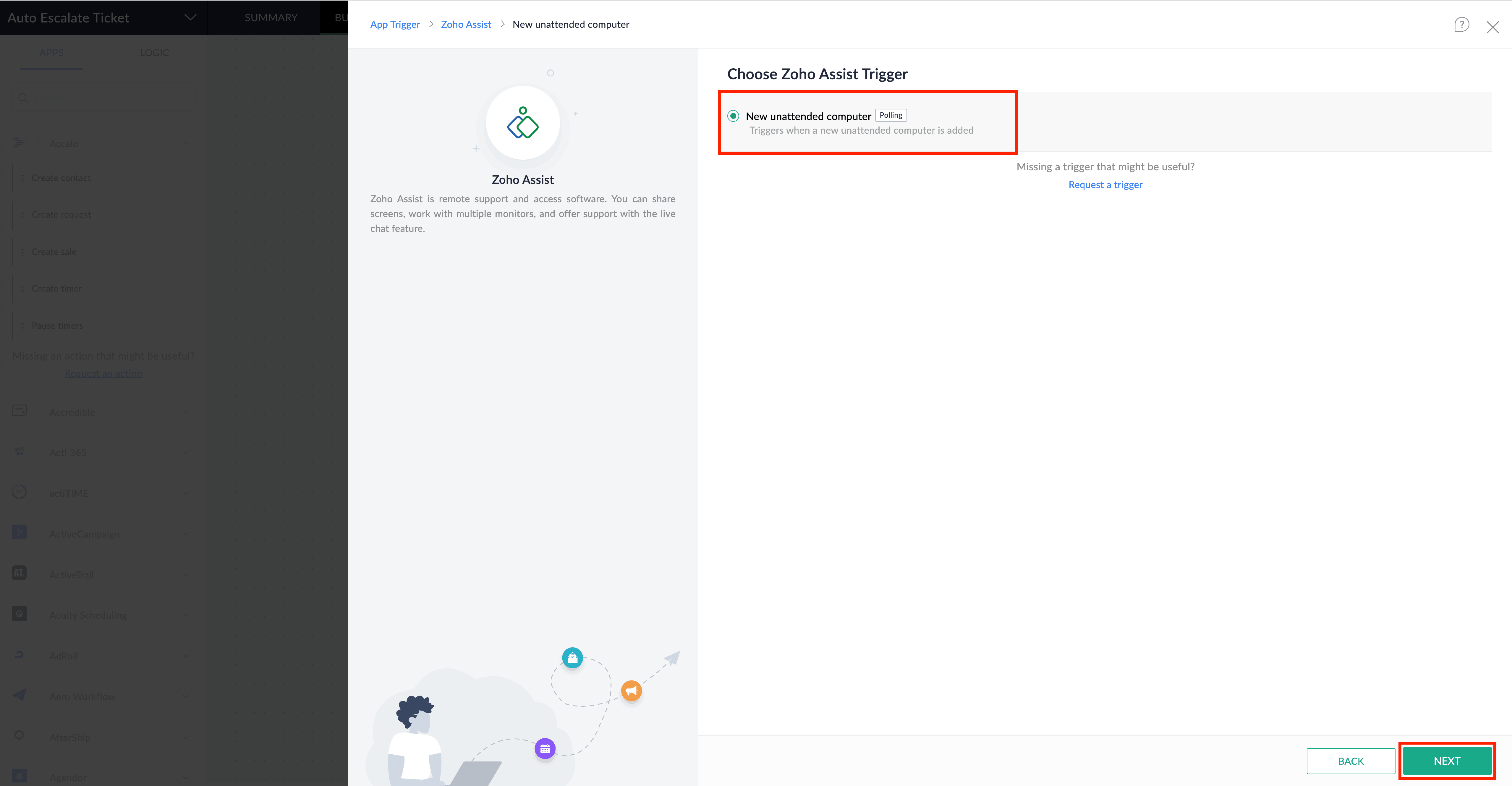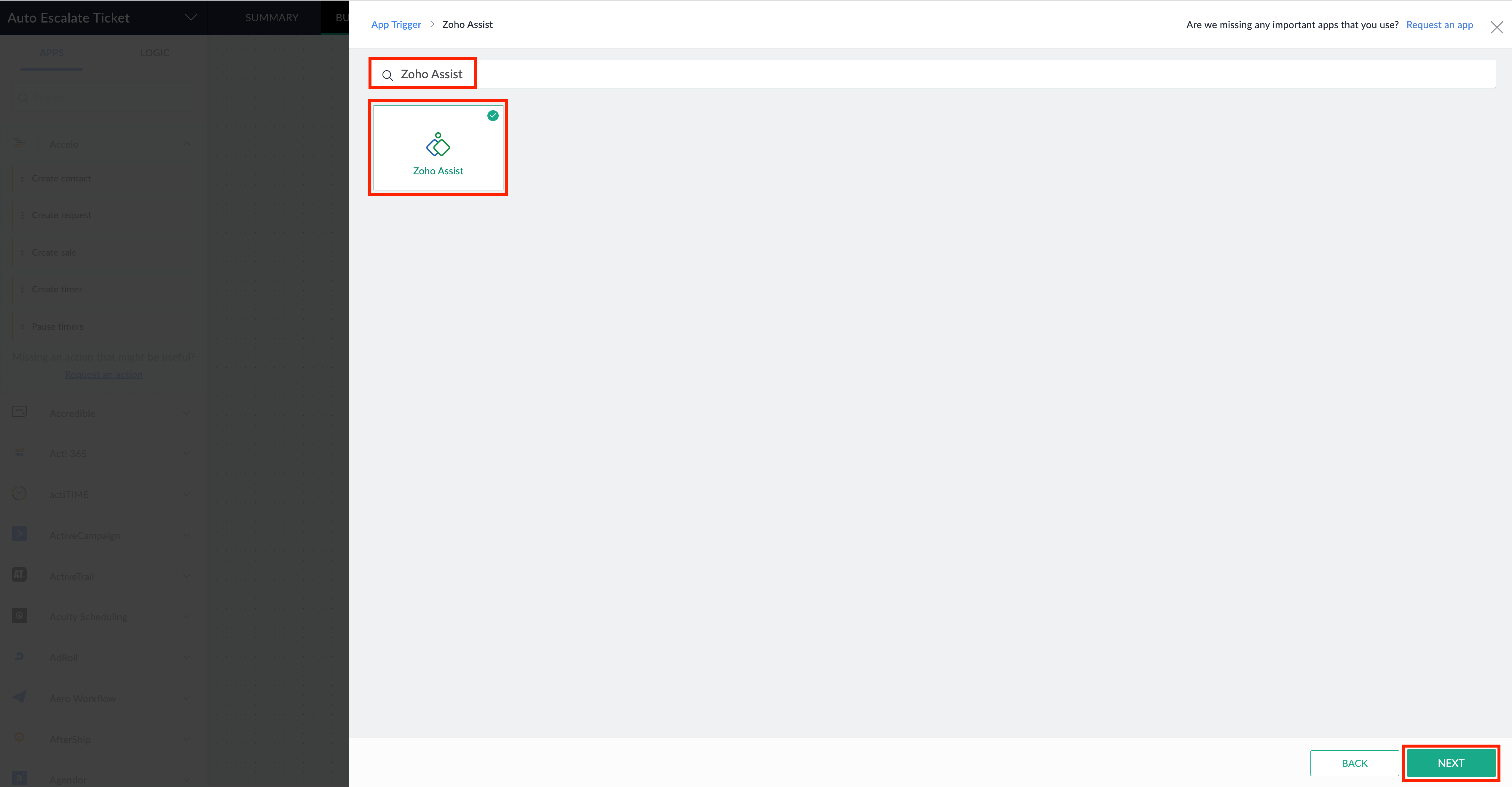 - Search and select "Zoho Assist" in the app trigger window and continue by pressing Next.