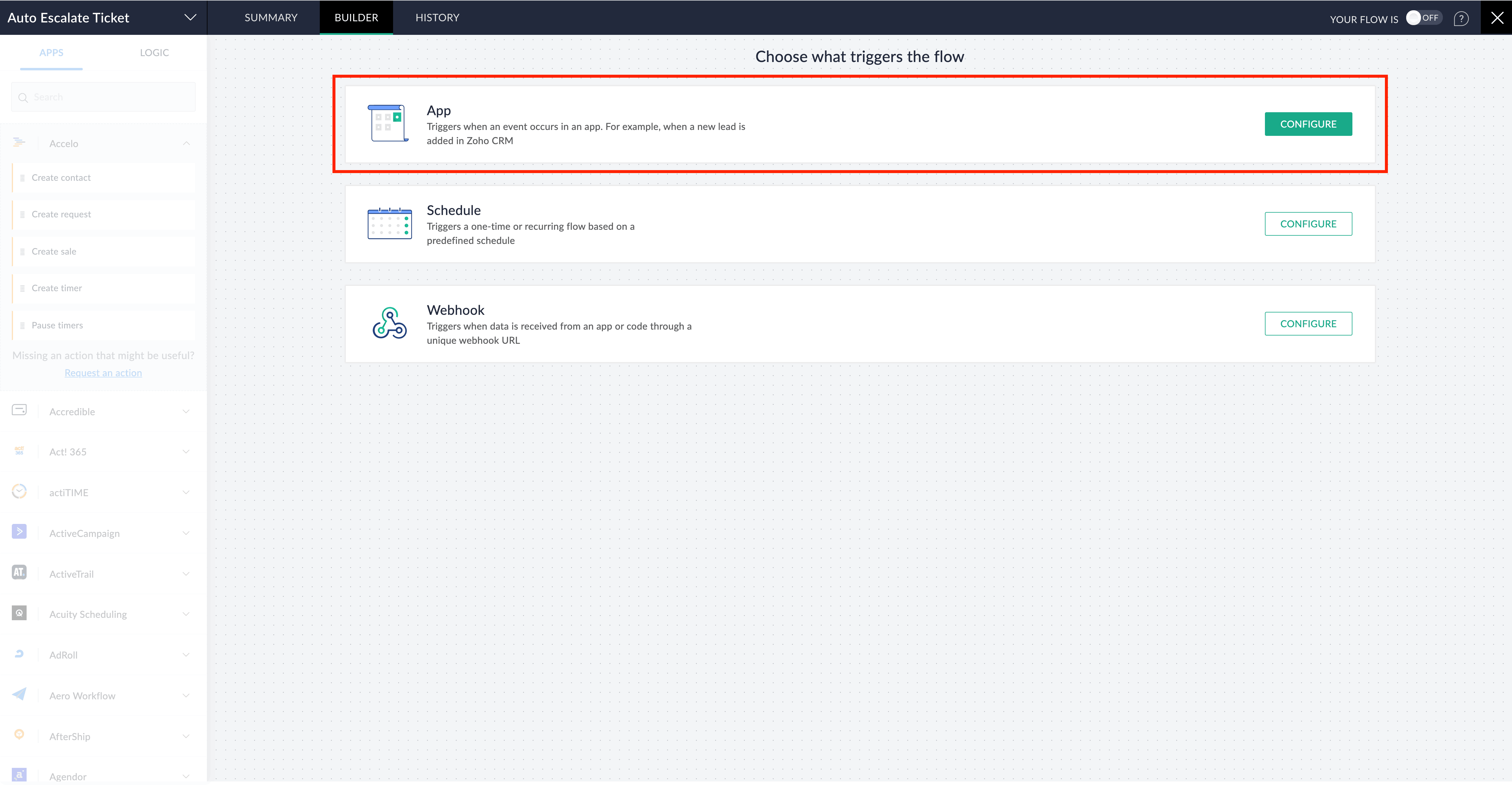 - Choose the app-based trigger from the available triggers - App, Schedule & Webhook and click Configure.