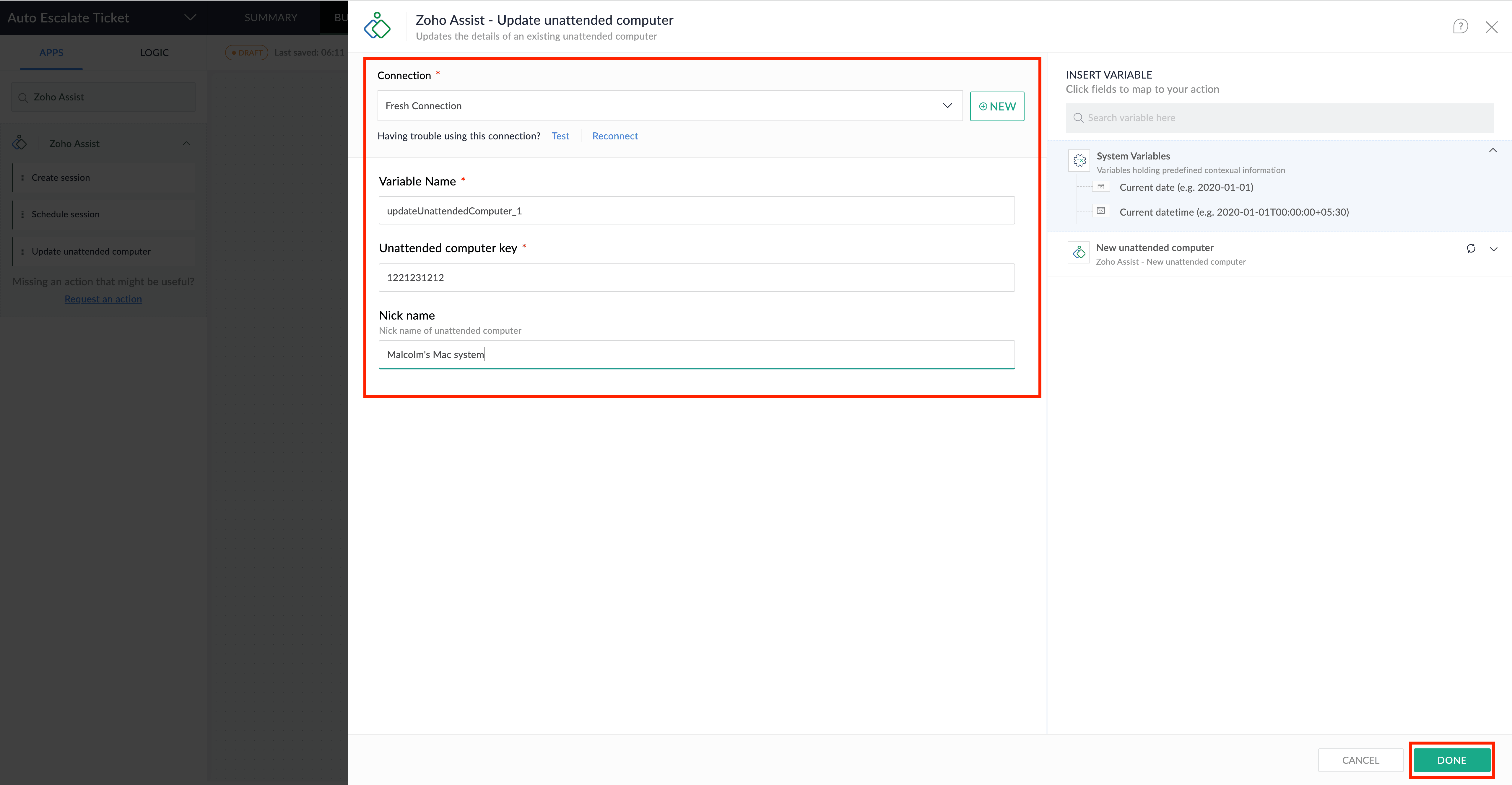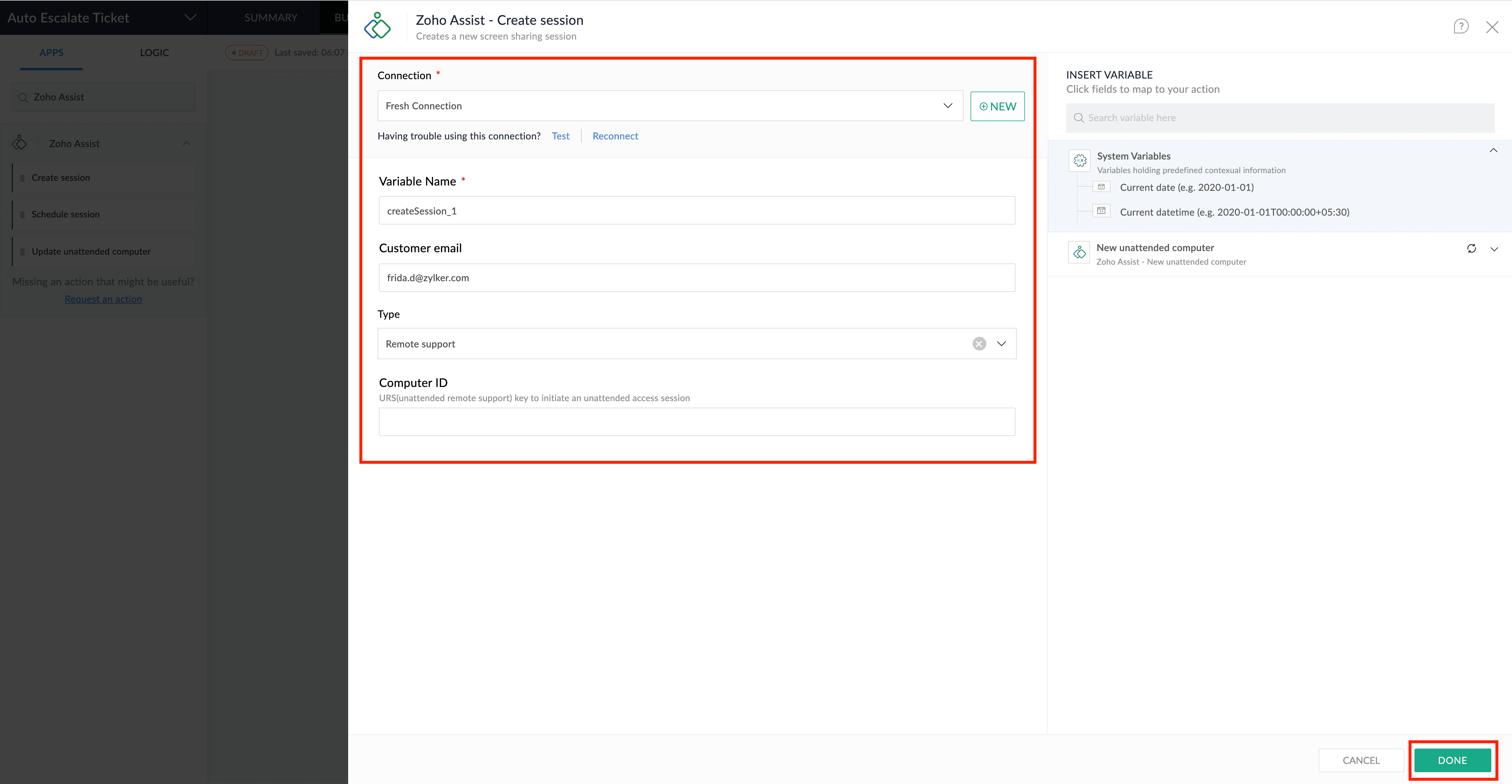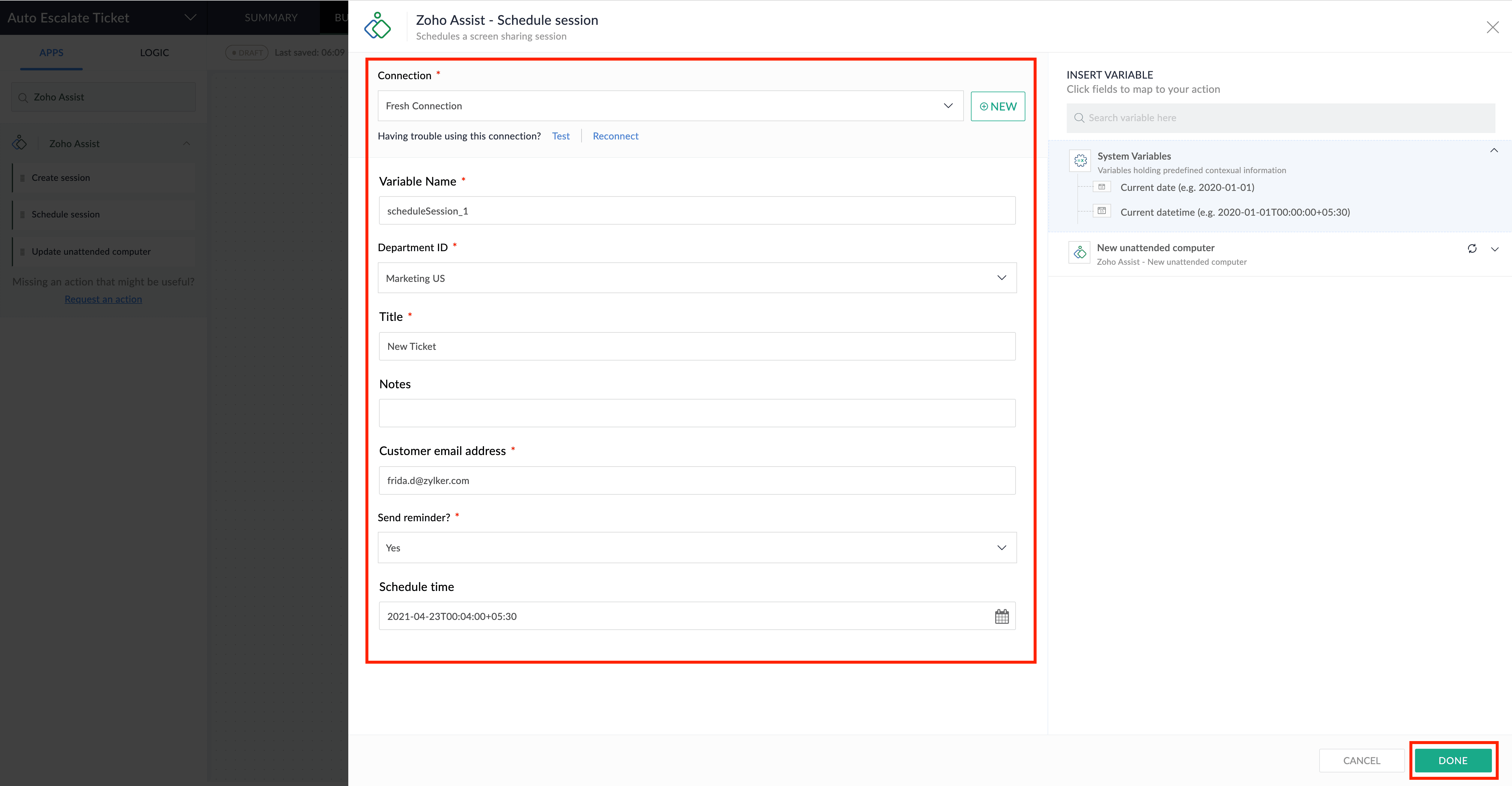 - Click Done after filling in the variable name and selecting your department to complete setting up Zoho Assist as a trigger application in Zoho Flow.
