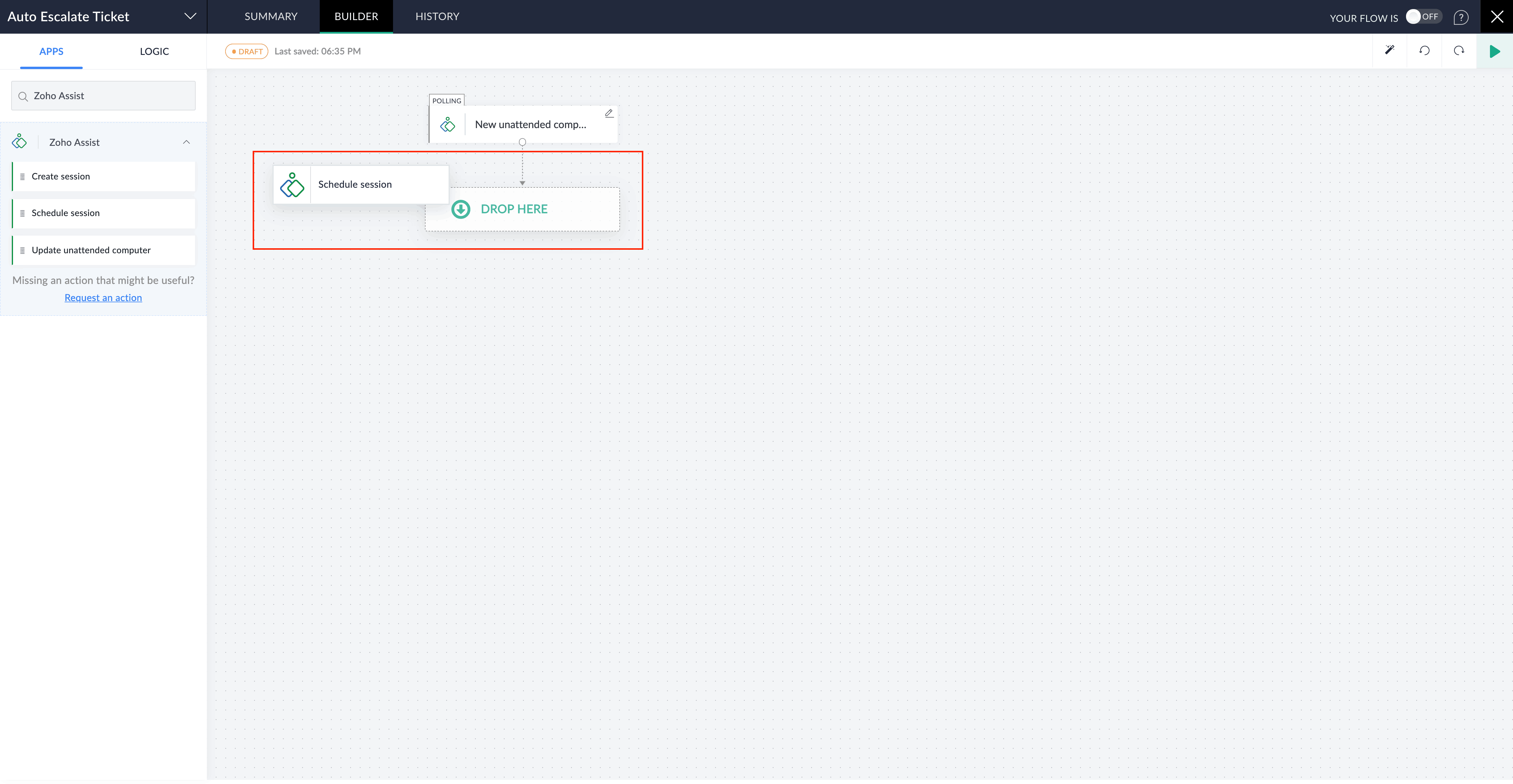 - Drag and drop the Schedule Session action from the Zoho Assist dropdown to plan and organize a remote session with reminders.