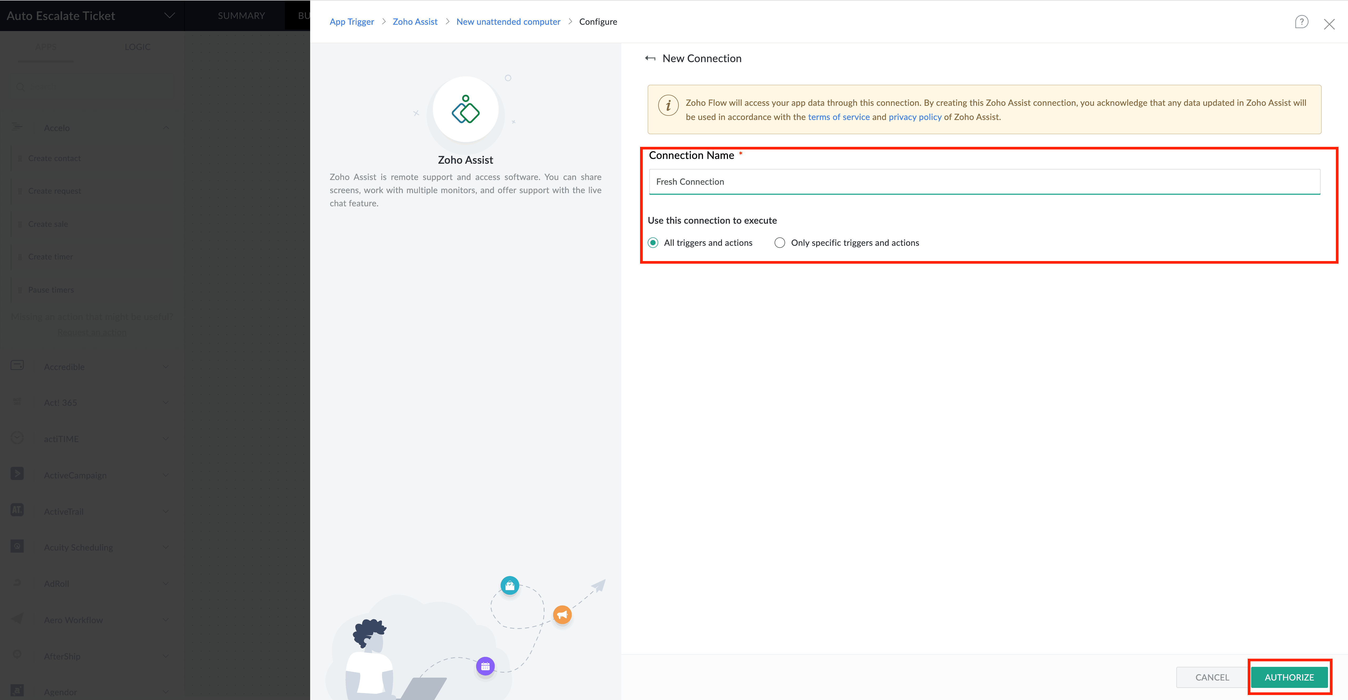 - Configure the details of your connection by specifying the connection name and customizing it with required actions and triggers, then click Authorize.