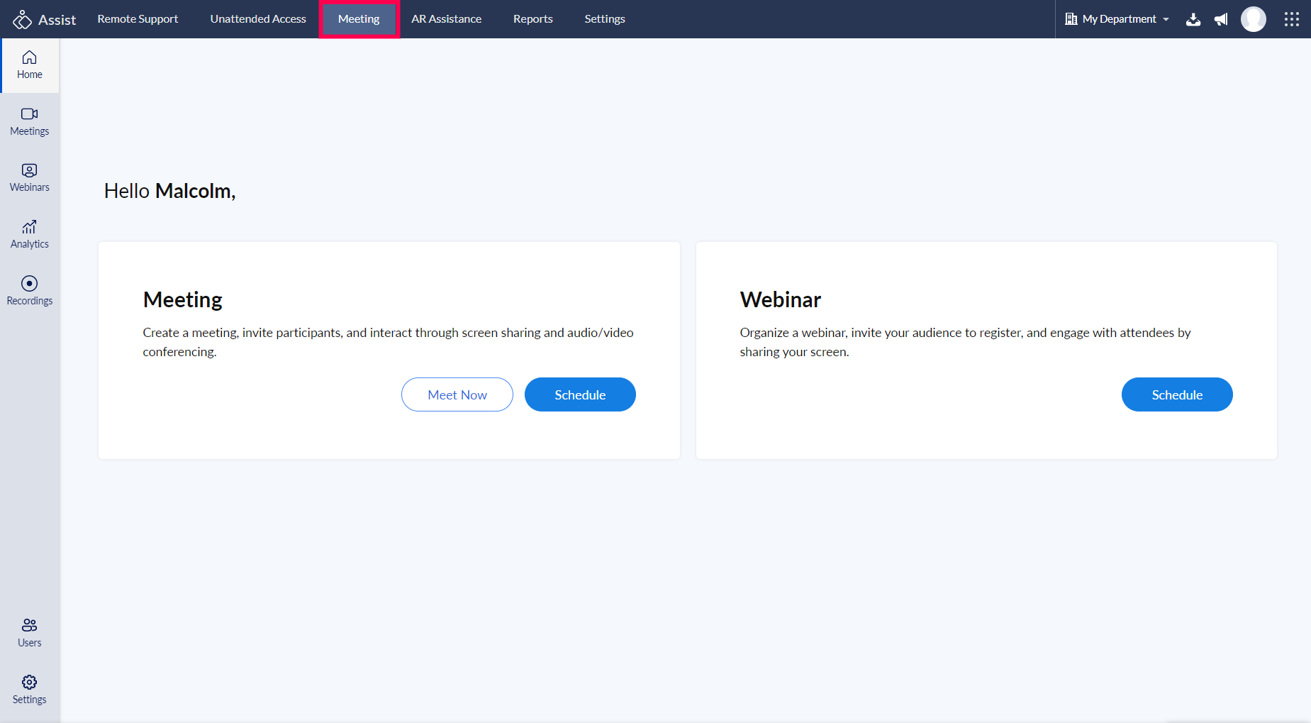 In an online meeting, the technician invites the customers or users by sending them an invitation. All participants of the meeting can listen to and speak with each other, unlike a webinar. Technician can either start an instant meeting with the user, or can schedule the meeting for later.