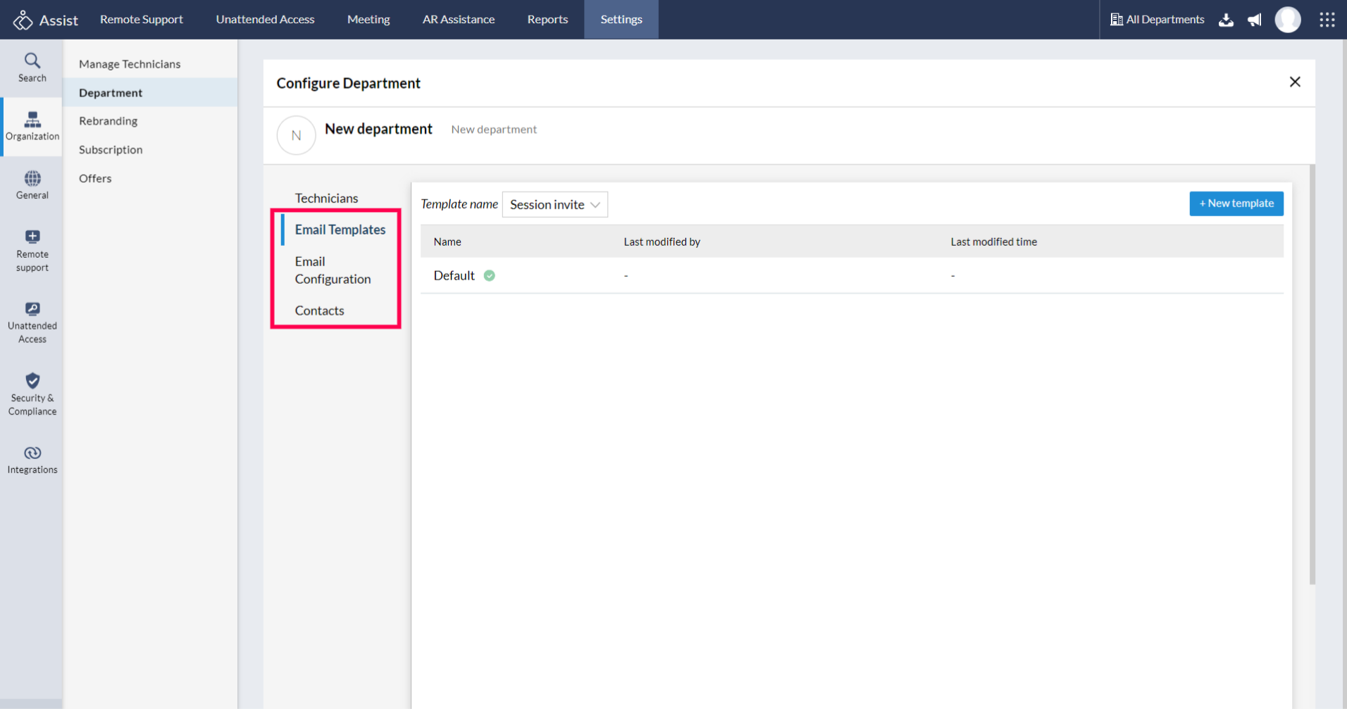 Departments allows you to create and manage multiple divisions within your organization. Departments can be classified based on your customer's organization, product, geographic location or workgroup. Each department can have its own set of technicians, email templates, email configuration, and contacts. Adding a department