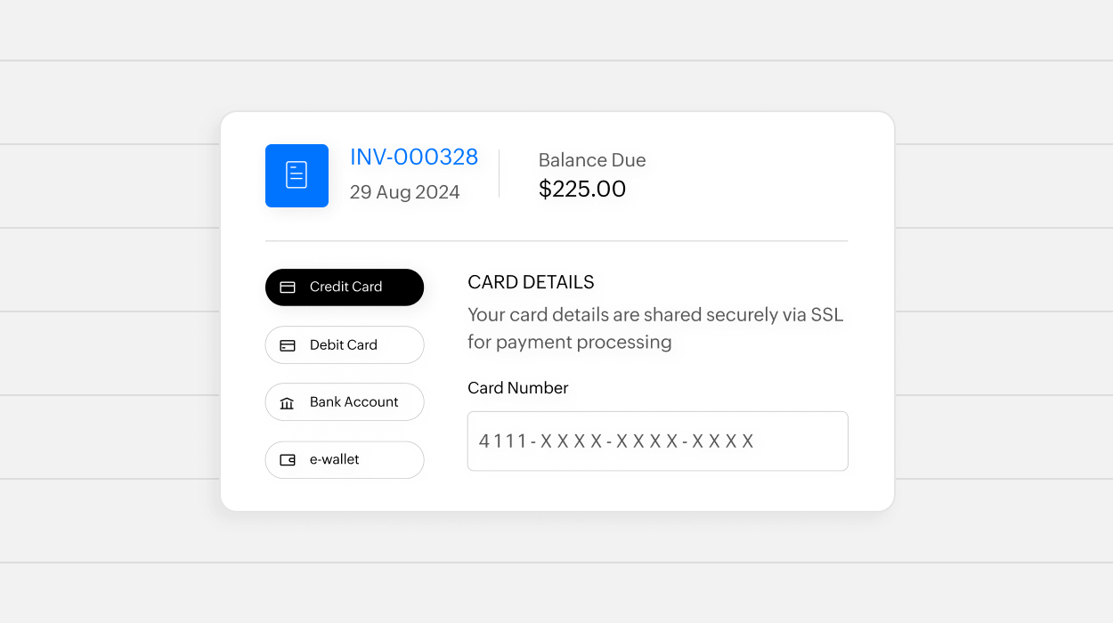 Accept payments from your customers via cards, e-wallets, UPI, and ACH.