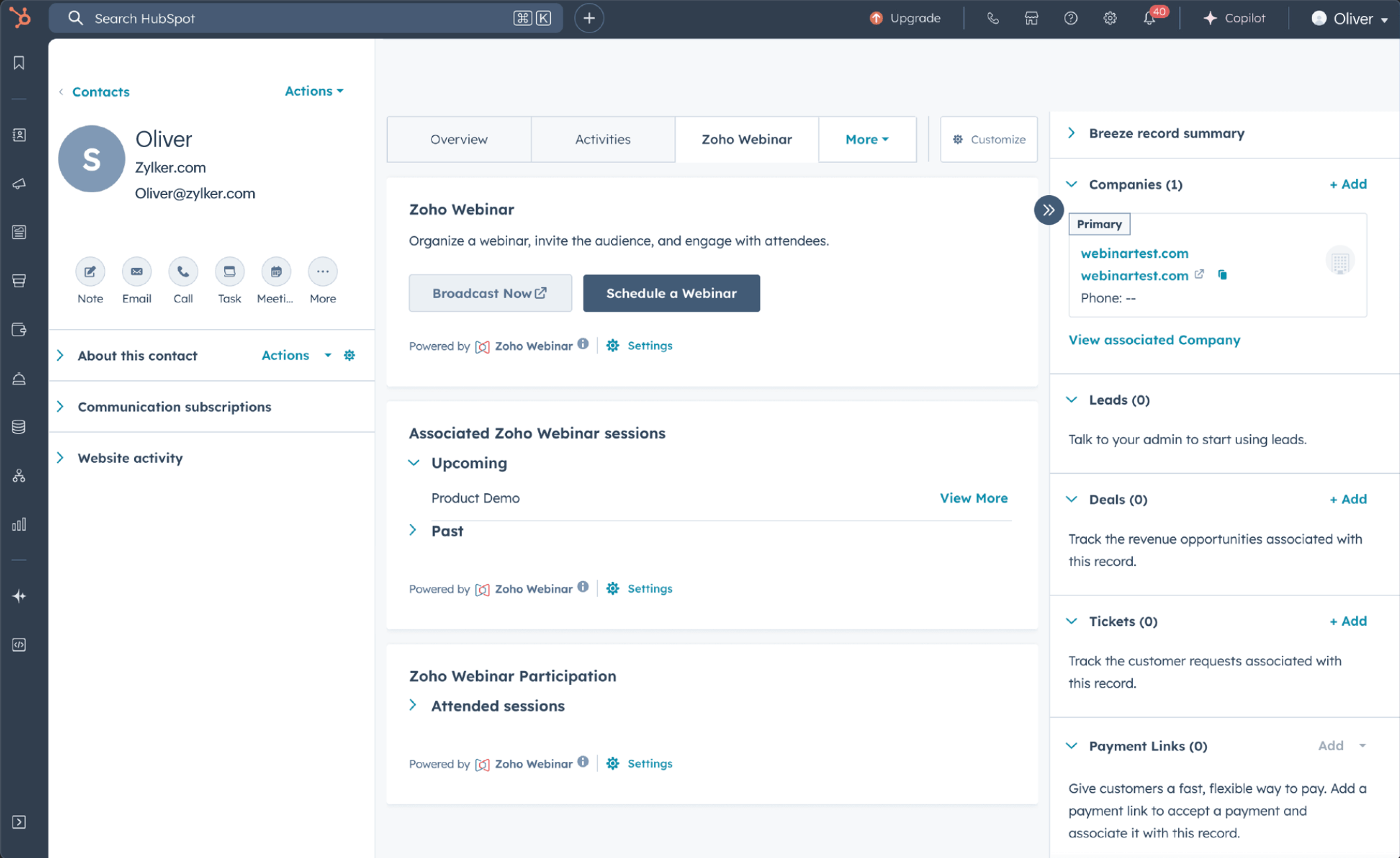 الآن تخيّل أن منصة الندوات ونظام إدارة علاقات العملاء CRM يعملان يدًا بيد ويزامنان بياناتك تلقائيًا. هذا بالضبط ما يقدمه تكامل Zoho Webinar مع HubSpot.