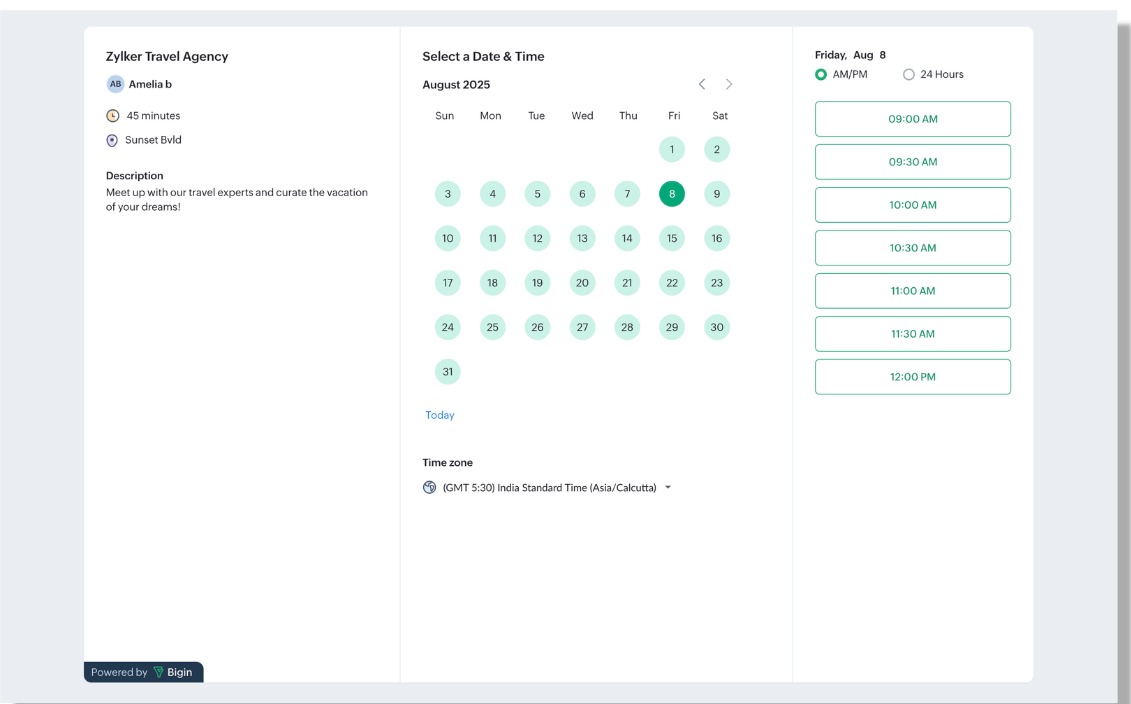 No more back and forth over phone calls. No more long email threads. Setting up meetings, whether it’s a one-on-one consultation, a doctor’s appointment, a demo session, or even a group webinar, is much simpler with Bigin’s Booking Pages.