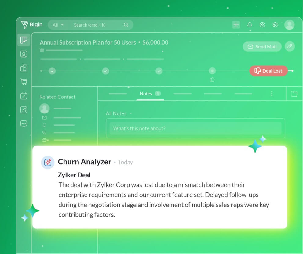 And when a deal is lost, the Churn Analyzer Agent steps in to uncover why! It'll scrutinize every lost deal to uncover whether it was due to delayed responses, lack of interest, or other factors and then share these insights with sales reps or their managers.
