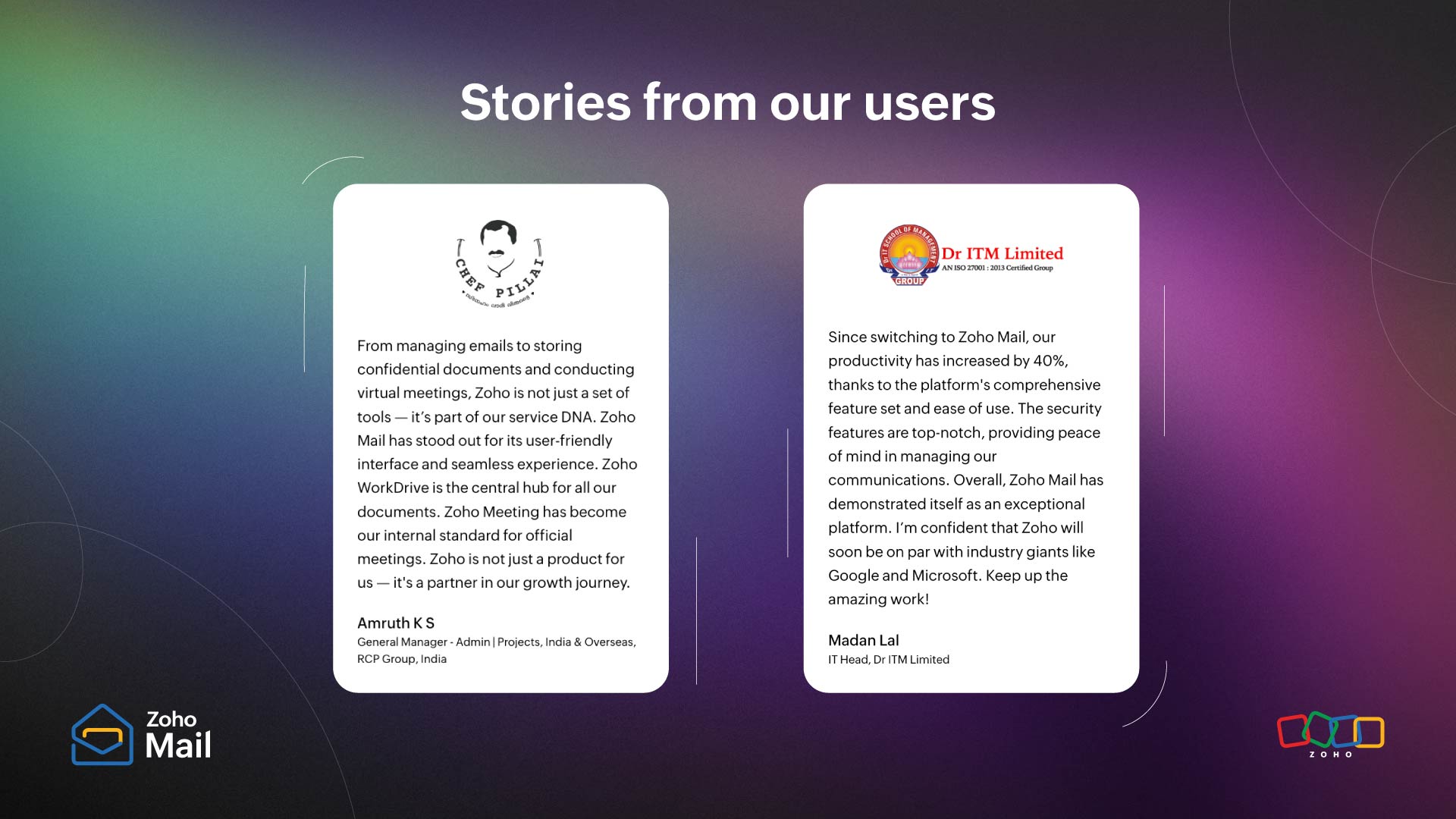 We’ve included a few of these stories below. Each one is a reminder of why we do what we do, and why listening to you will always be at the center of how Zoho Mail grows.