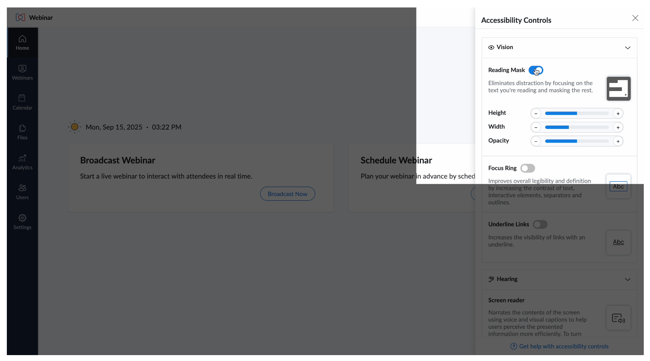 Zoho Webinar is committed to providing an inclusive webinar experience for everyone regardless of their abilities. Our accessibility controls are designed to support users with diverse needs, so everyone can engage meaningfully during webinars. Learn more.
