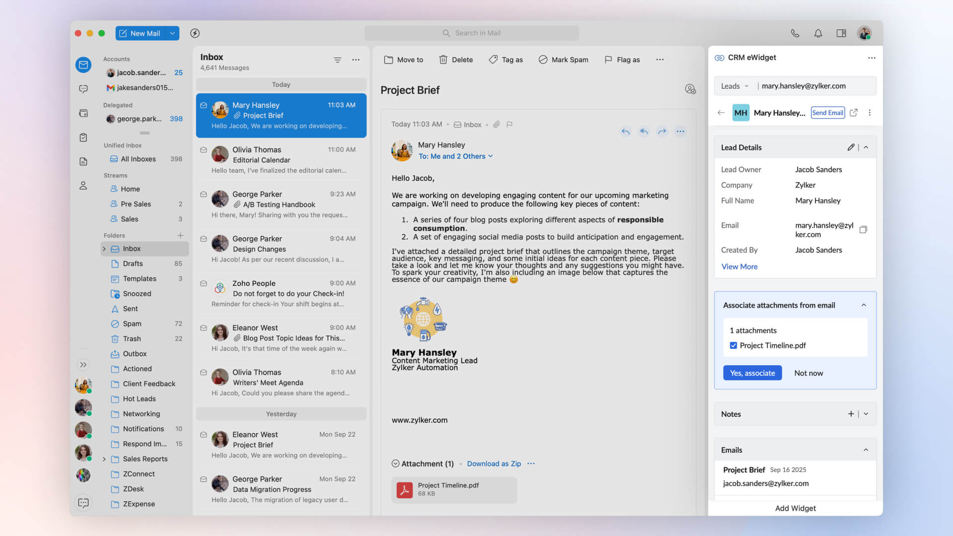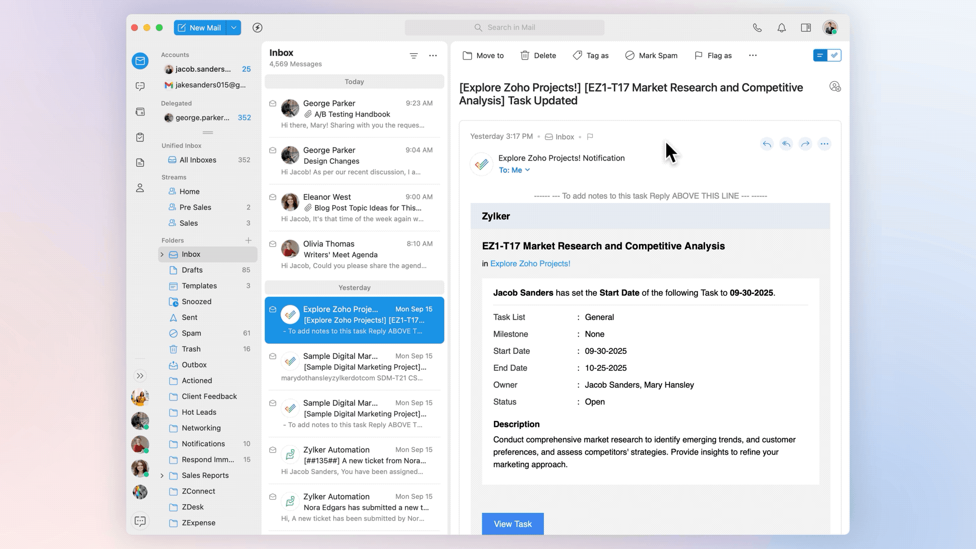 Smart Mail turns notification emails from Zoho apps into interactive, actionable emails—so you can approve expense requests from Zoho Expense, comment on tasks from Zoho Projects, resolve customer tickets from Zoho Desk, and more right from your inbox.