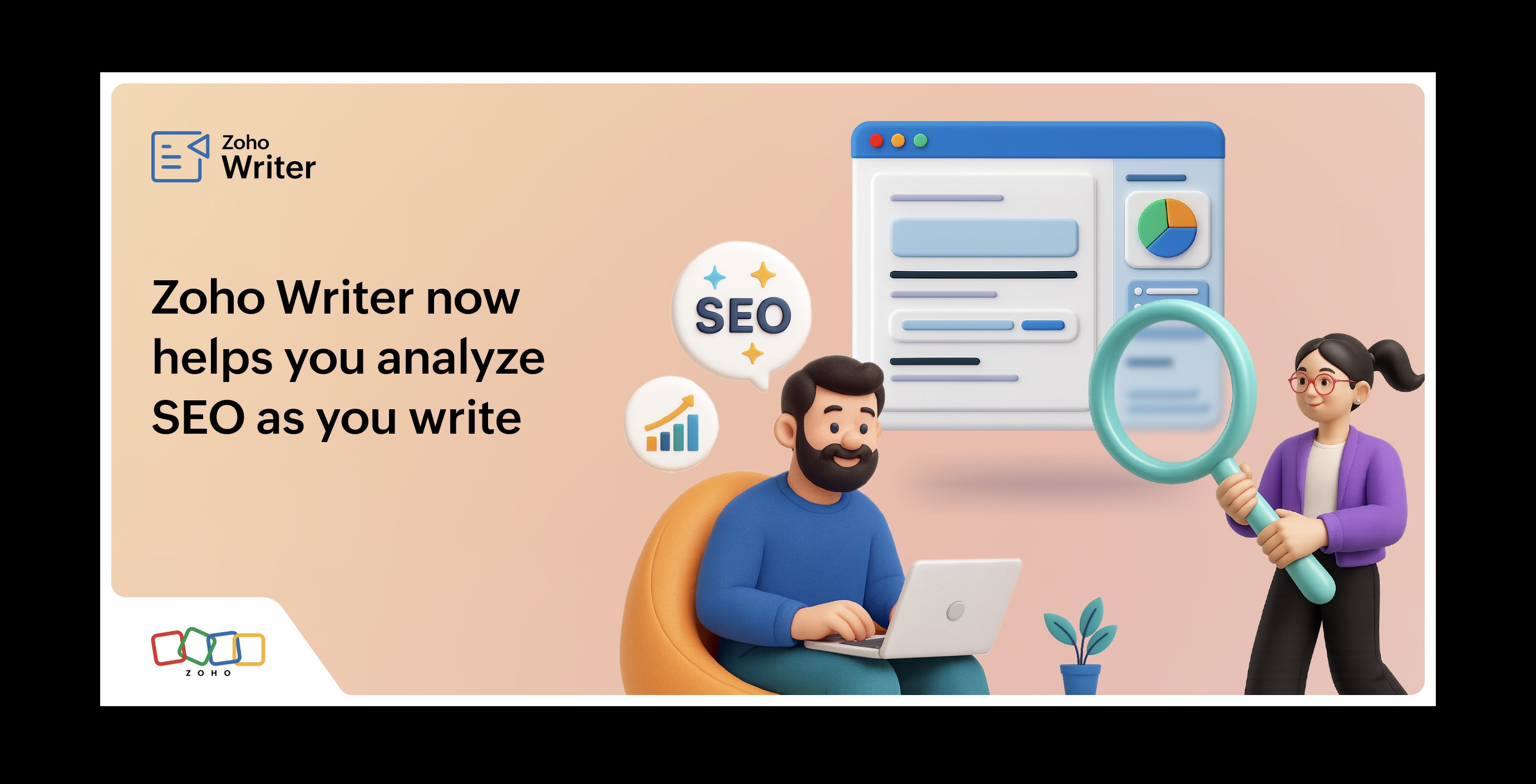 Now, imagine doing all these in a single window. With Zoho Writer's smart writing assistant Zia's SEO analysis capabilities, you can. We're excited because Zoho Writer is the first word processor on the market to offer a built-in SEO Analyzer.