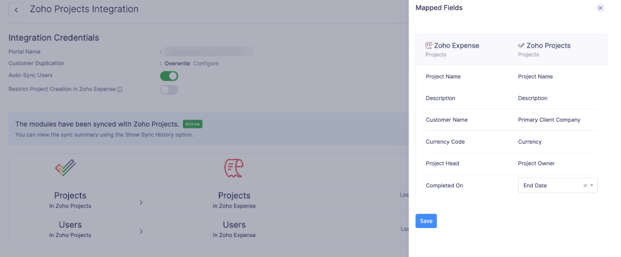 • If you reintegrate the same Zoho Projects portal with this organization, the records synced during the previous integration will be synced again, leading to duplication of records in Zoho Expense.