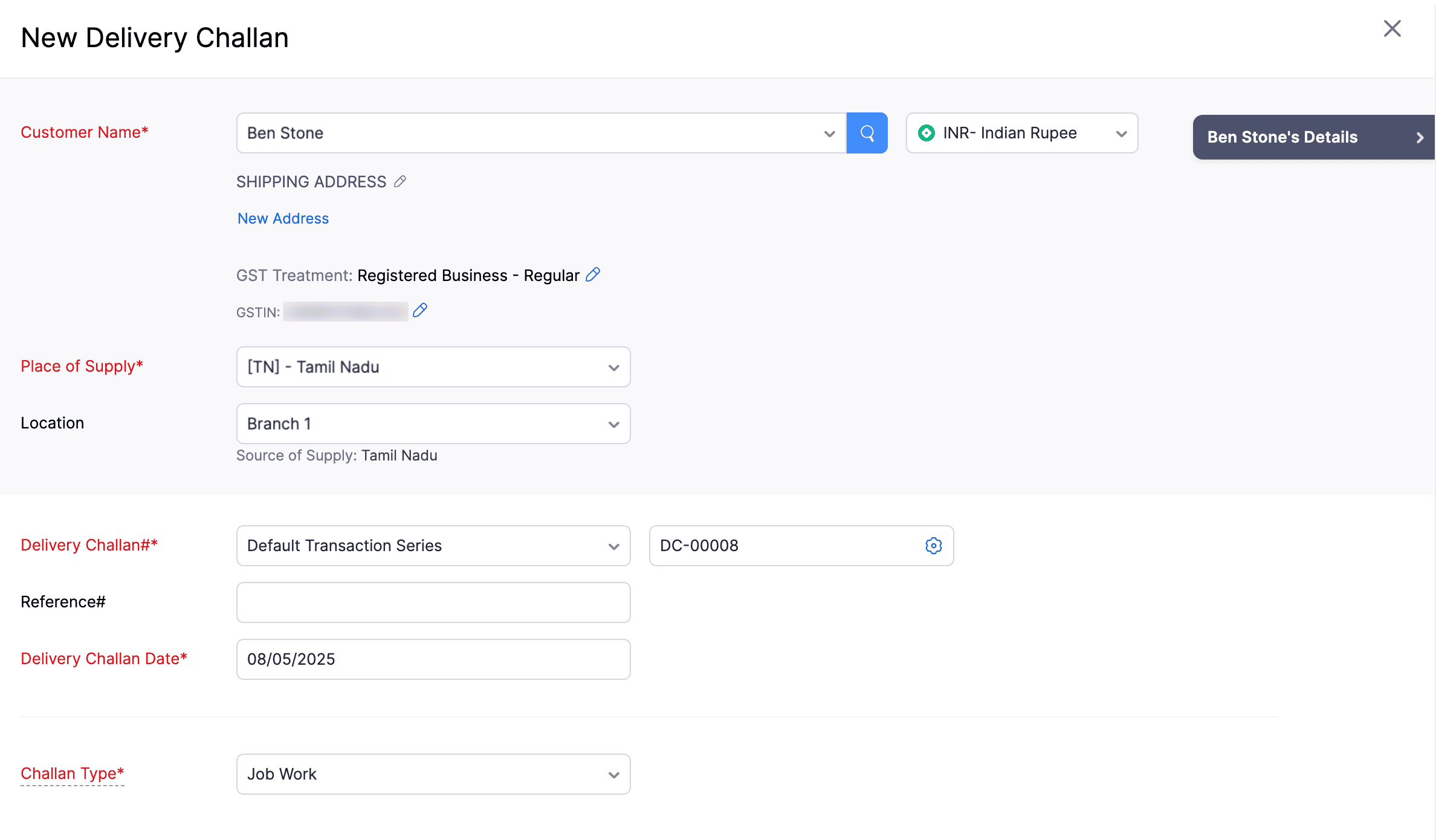 | Customer Name | Select the customer for whom you want to create a delivery challan. |