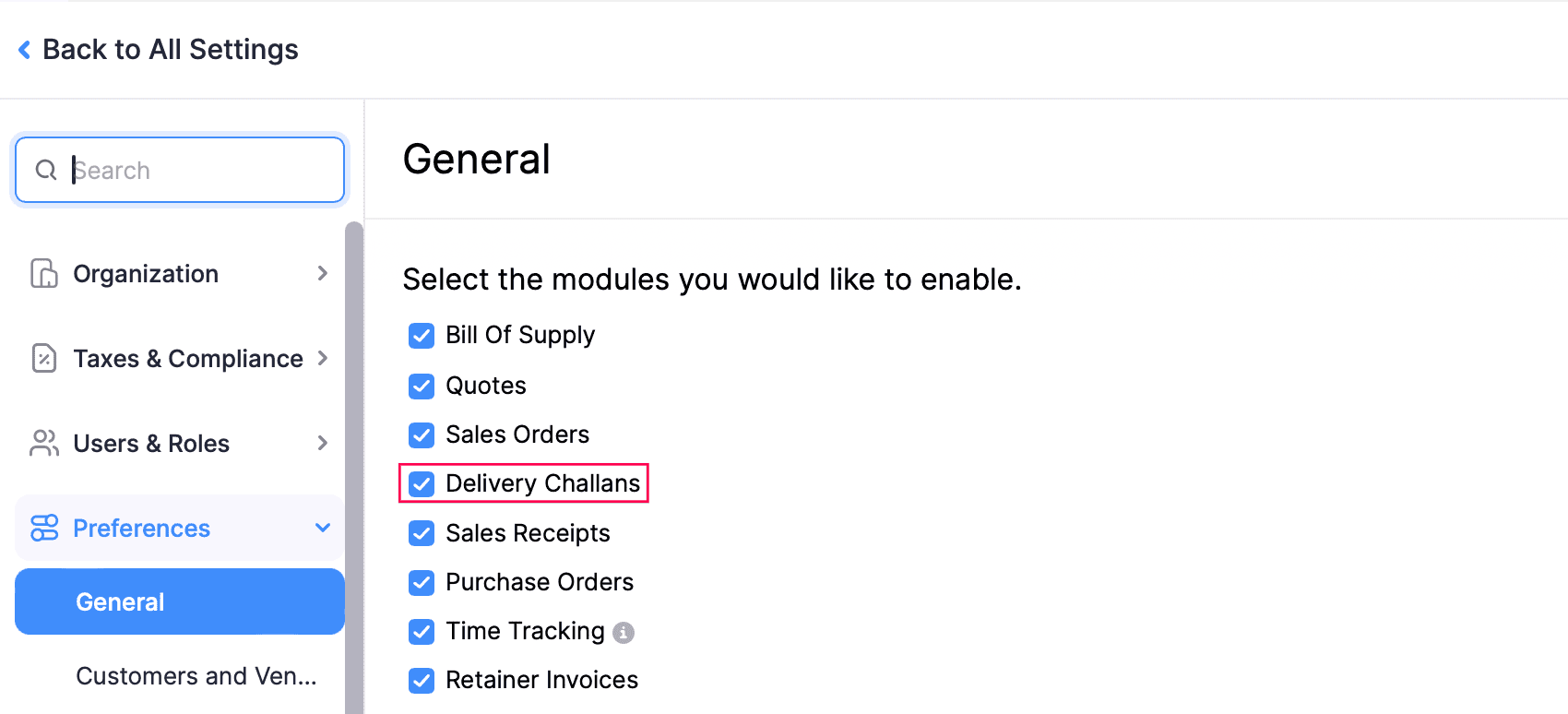 To create Delivery Challans in Zoho Books, you will have to enable the Delivery Challans module first. To do this: