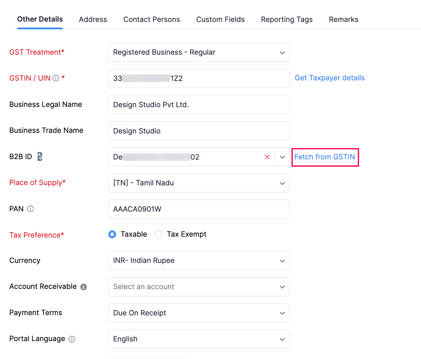- In the Other Details section and click Fetch from GSTIN click next to B2B ID.
