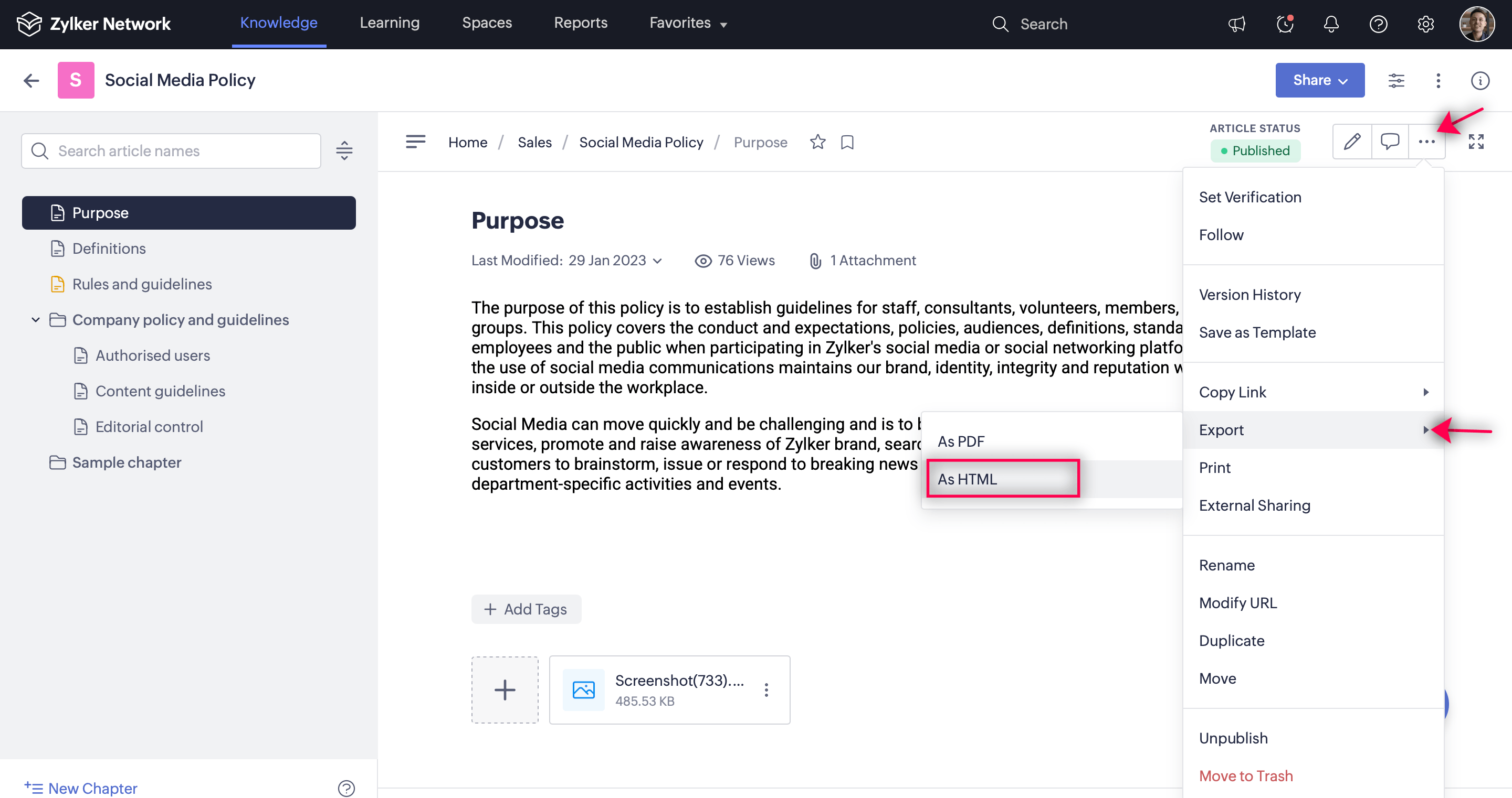 NewYou can now export individual articles along with it's attachments as HTML files in Zoho Learn.