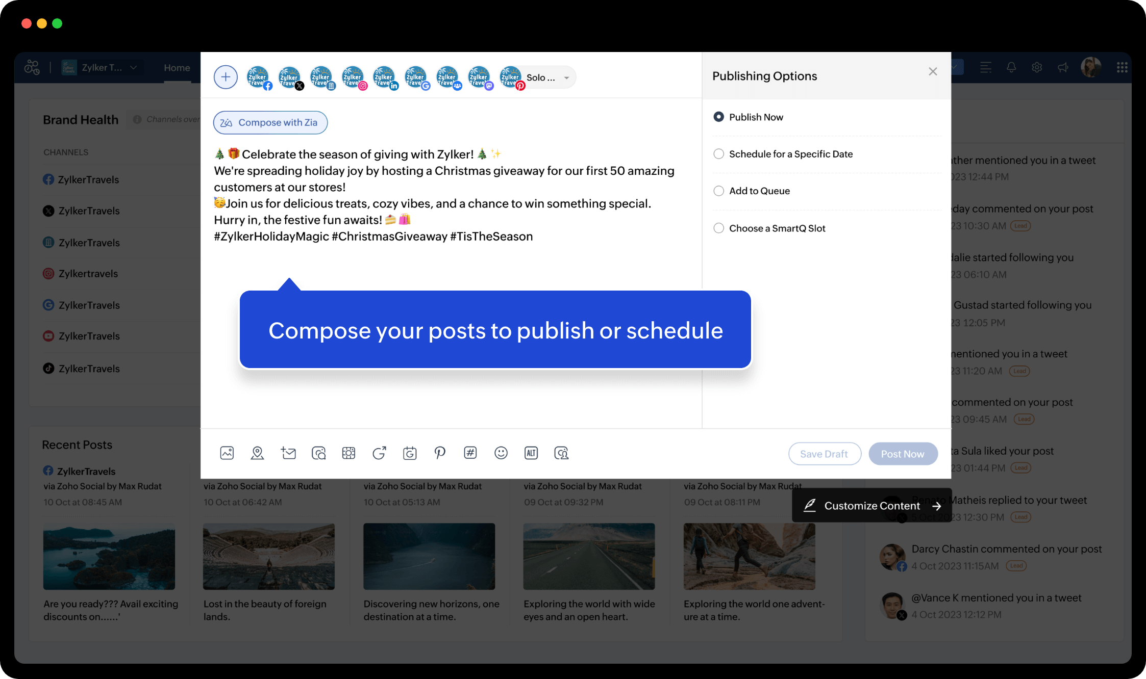 Explore the compose window and its various options to scale up your posts. Preview, draft, publish, or schedule content on all your social channels across your brands.