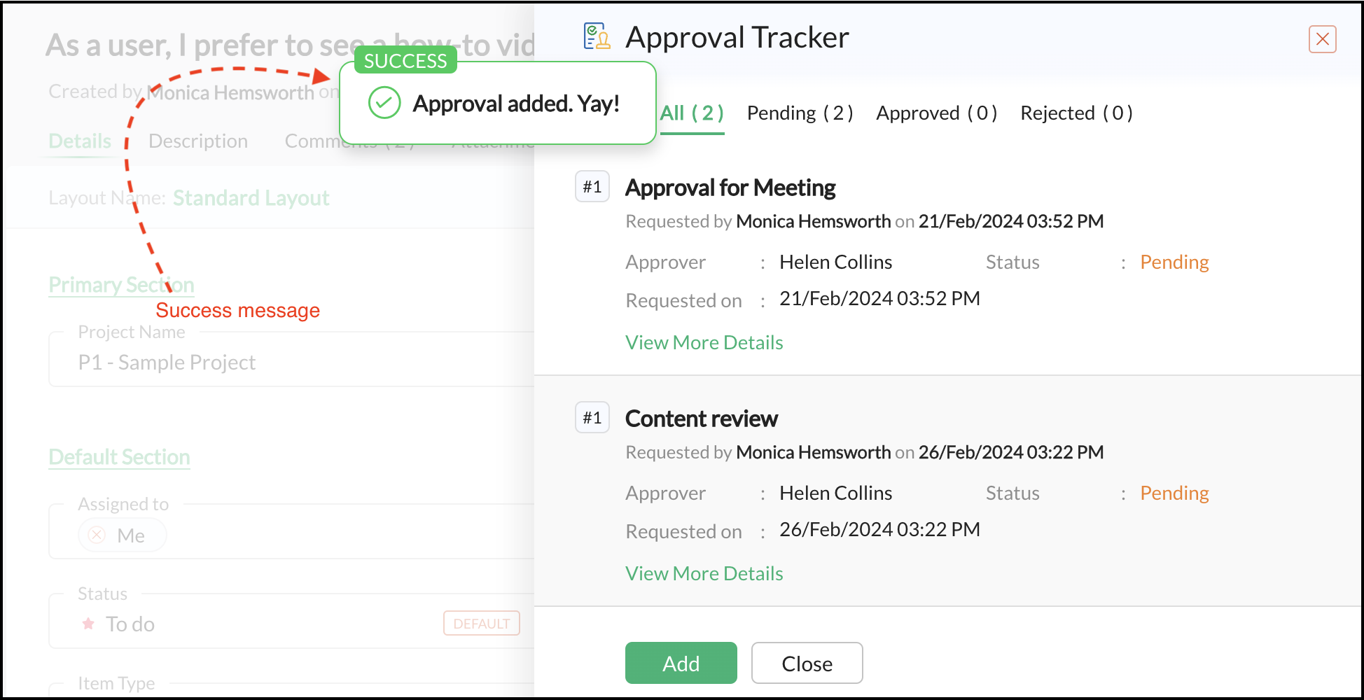 .catch(FailureHandler);- message: confirmation message.