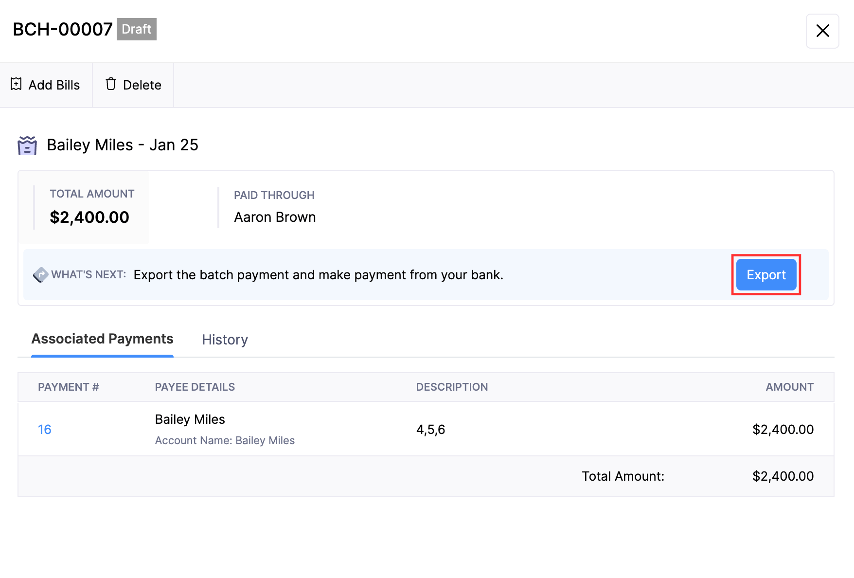 - Click Add Bills. Continue from step 5 of the Create a Batch section.
