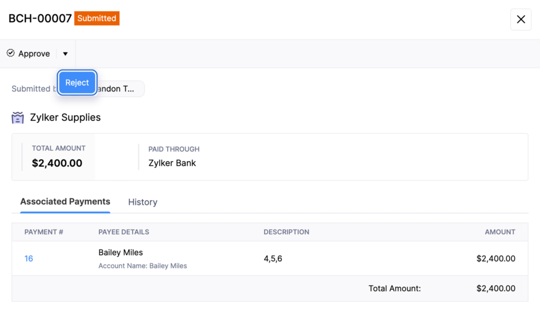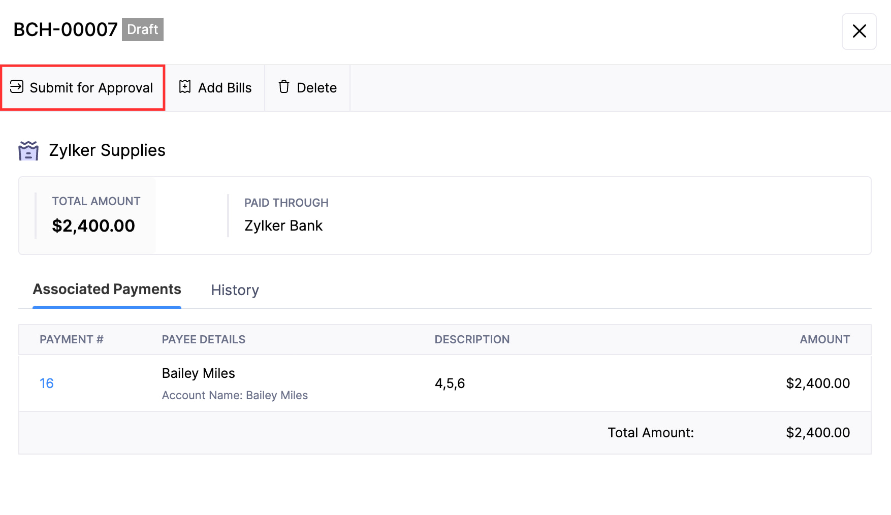 Once you’ve made payment for the bills included in a batch, you can mark the batch as processed in Zoho Books to update the payment status. Here’s how: